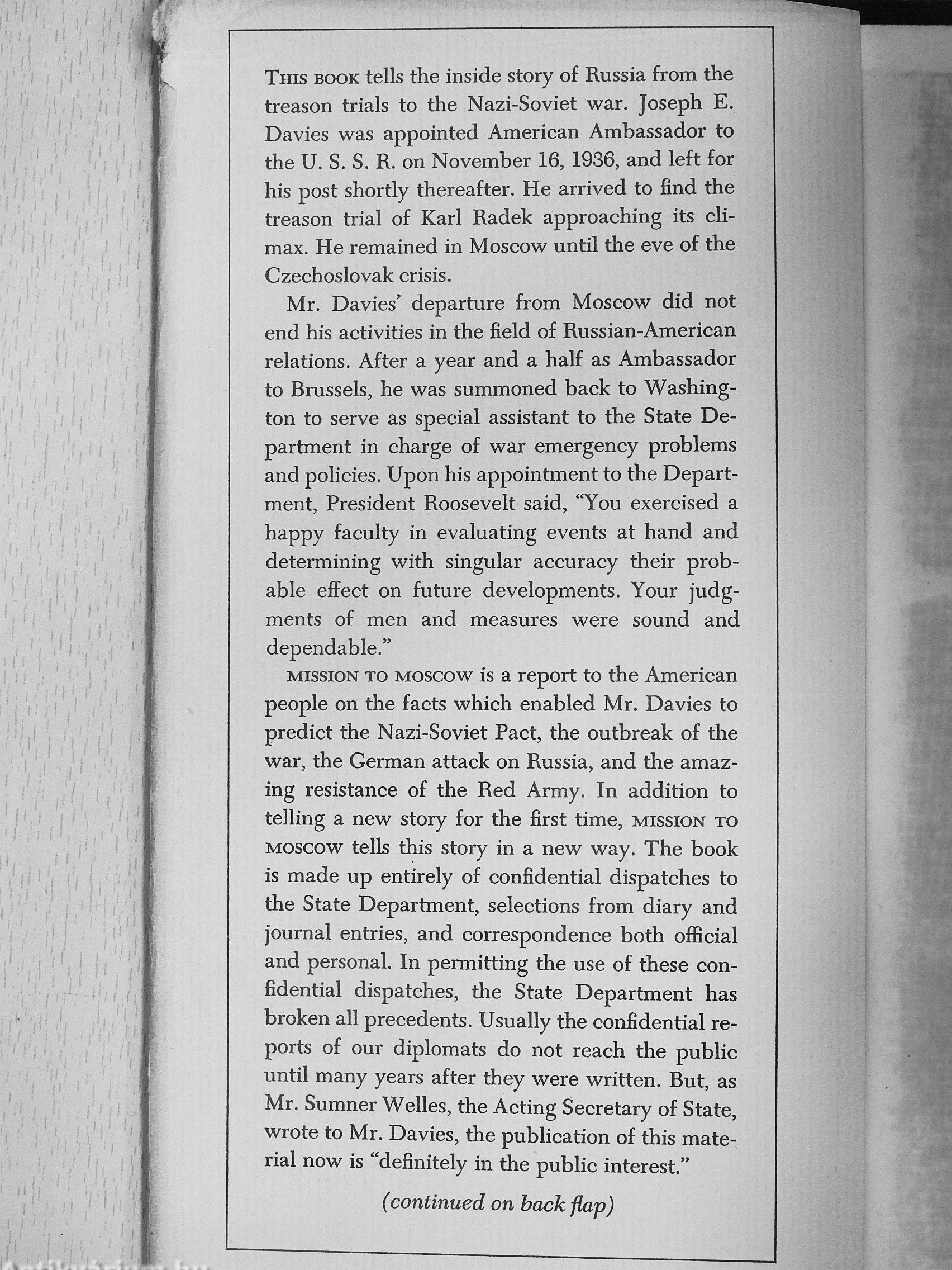 From beginning to end mission to Moscow presents a comprehensive picture of the Soviet Union as it was seen by a man who made no secret of his capitalistic interests but who went there with an open mind and an understanding heart.