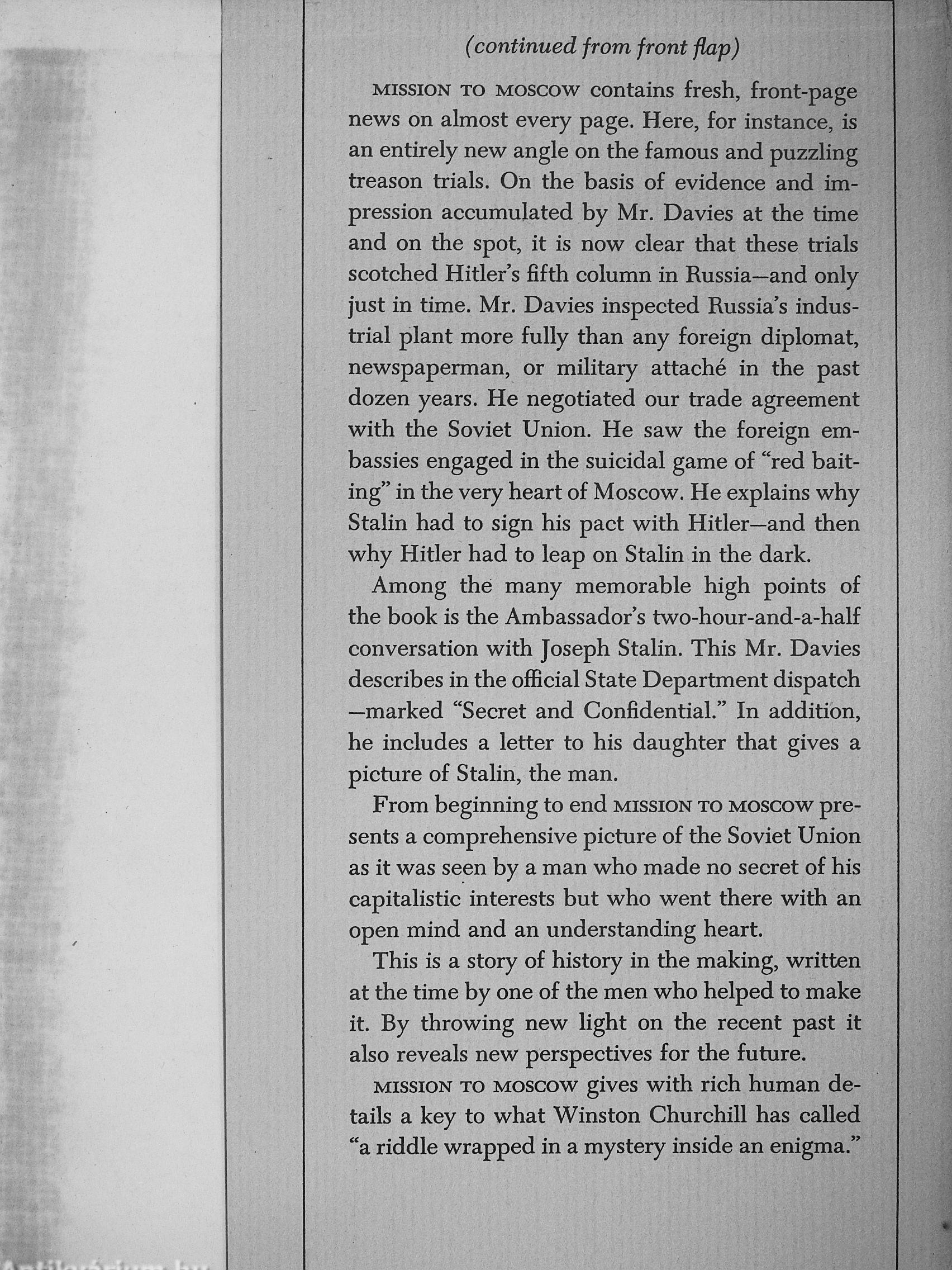 MISSION TO MOSCOW Contains fresh, front-page news on almost every page. Here, for instance, is an entirely new angle on the famous and puzzling treason trials. On the basis of evidence and impression accumulated by Mr. Davies at the time and on the spot, it is now clear that these trials scotched Hitler's fifth column in Russia—and only just in time. Mr. Davies inspected Russia's industrial plant more fully than any foreign diplomat, newspaperman, or military attaché in the past dozen years. He negotiated our trade agreement with the Soviet Union. He saw the foreign embassies engaged in the suicidal game of "red baiting" in the very heart of Moscow. He explains why Stalin had to sign his pact with Hitler—and then why Hitler had to leap on Stalin in the dark.