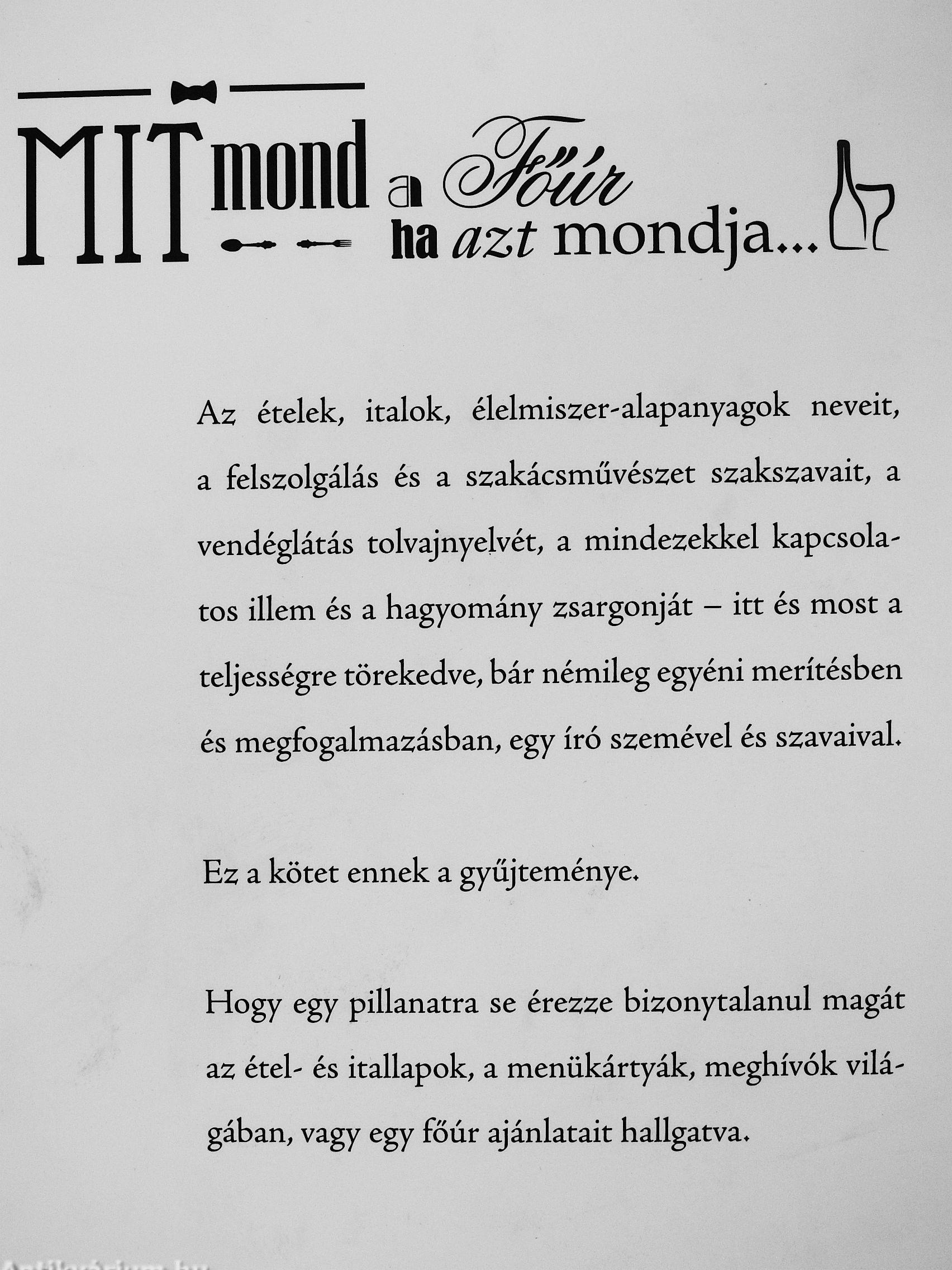 Az ételek, italok, élelmiszer-alapanyagok neveit, a felszolgálás és a szakácsművészet szakszavait, a vendéglátás tolvajnyelvét, a mindezekkel kapcsolatos illem és a hagyomány zsargonját - itt és most a teljességre törekedve, bár némileg egyéni merítésben és megfogalmazásban, egy író szemével és szavaivaL