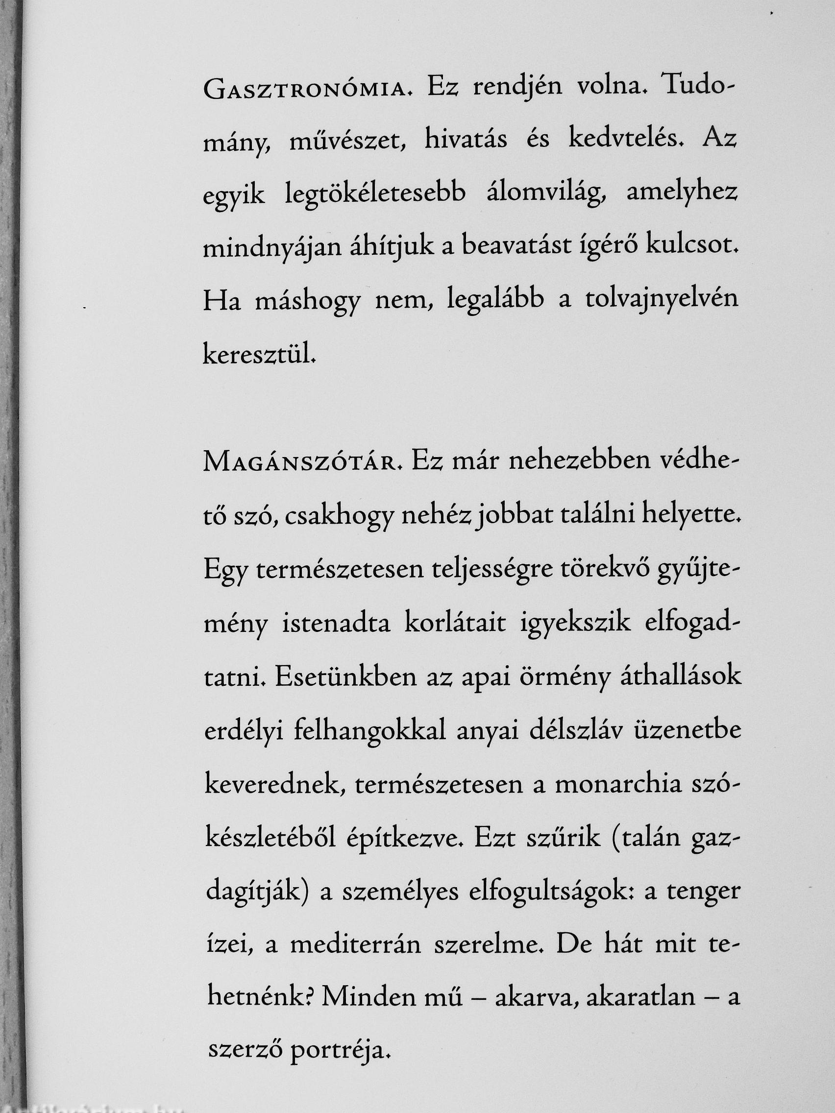 Magánszótár. Ez már nehezebben védhető szó, csakhogy nehéz jobbat találni helyette. Egy természetesen teljességre törekvő gyűjtemény istenadta korlátait igyekszik elfogadtatni, Esetünkben az apai örmény áthallások erdélyi felhangokkal anyai délszláv üzenetbe keverednek, természetesen a monarchia szókészletéből építkezve. Ezt szűrik (talán gazdagítják) a személyes elfogultságok: a tenger ízei, a mediterrán szerelme. De hát mit tehetnénk? Minden mű - akarva, akaratlan - a szerző portréja. Vissza
