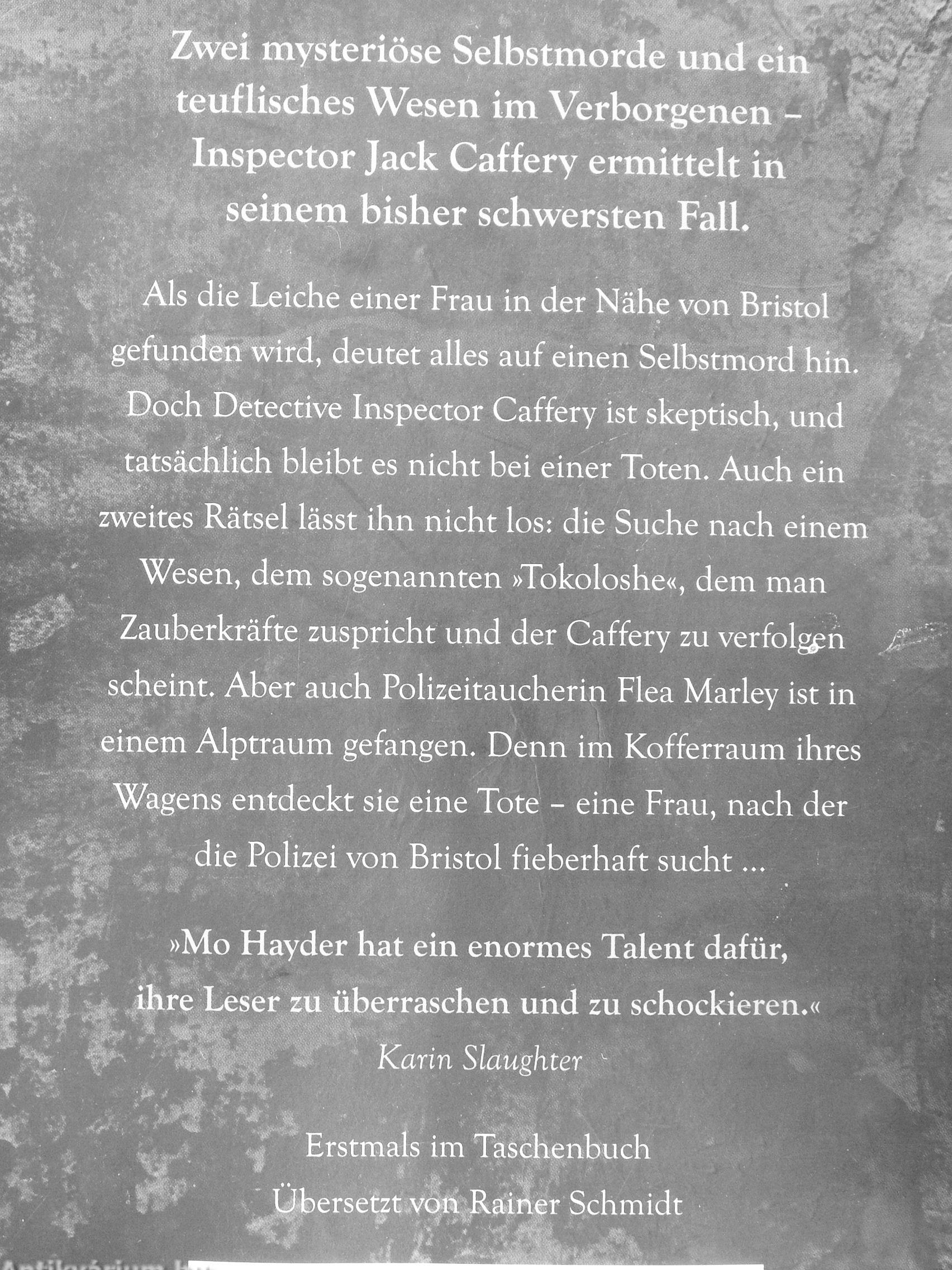 Als die Leiche einer Frau in der Nähe von Bristol gefunden wird, deutet alles auf einen Selbstmord hin. Doch Detective Inspector Caffery ist skeptisch, und tatsächlich bleibt es nicht bei einer Toten. Auch ein weites Rätsel lässt ihn nicht los: die Suche nach einem Wesen, dem sogenannten »Tokoloshe«, dem man Zauberkräfte zuspricht und der Caffery zu verfolgen scheint. Aber auch Polizeitaucherin Flea Marley ist in einem Alptraum gefangen. Denn im Kofferraum ihres Wagens entdeckt sie eine Tote - eine Frau, nach der die Polizei von Bristol fieberhaft sucht
