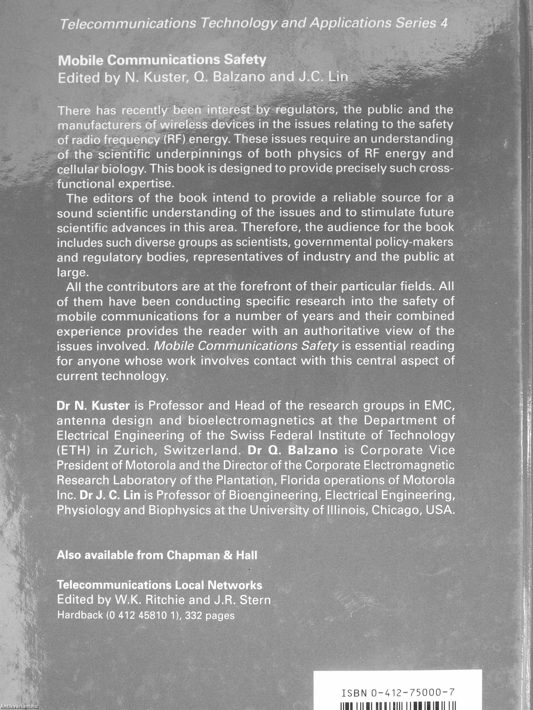 Dr N. Küster is Professor and Head of the research groups in EMC, antenna design and bioelectromagnetics at the Department of Electrical Engineering of the Swiss Federal Institute of Technology (ETH) in Zurich, Switzerland. Dr Q. Balzano is Corporate Vice President of Motorola and the Director of the Corporate Electromagnetic Research Laboratory of the Plantation, Florida operations of Motorola Inc. Dr J. C. Lin is Professor of Bioengineering, Electrical Engineering, Physiology and Biophysics at the University of Illinois, Chicago, USA.