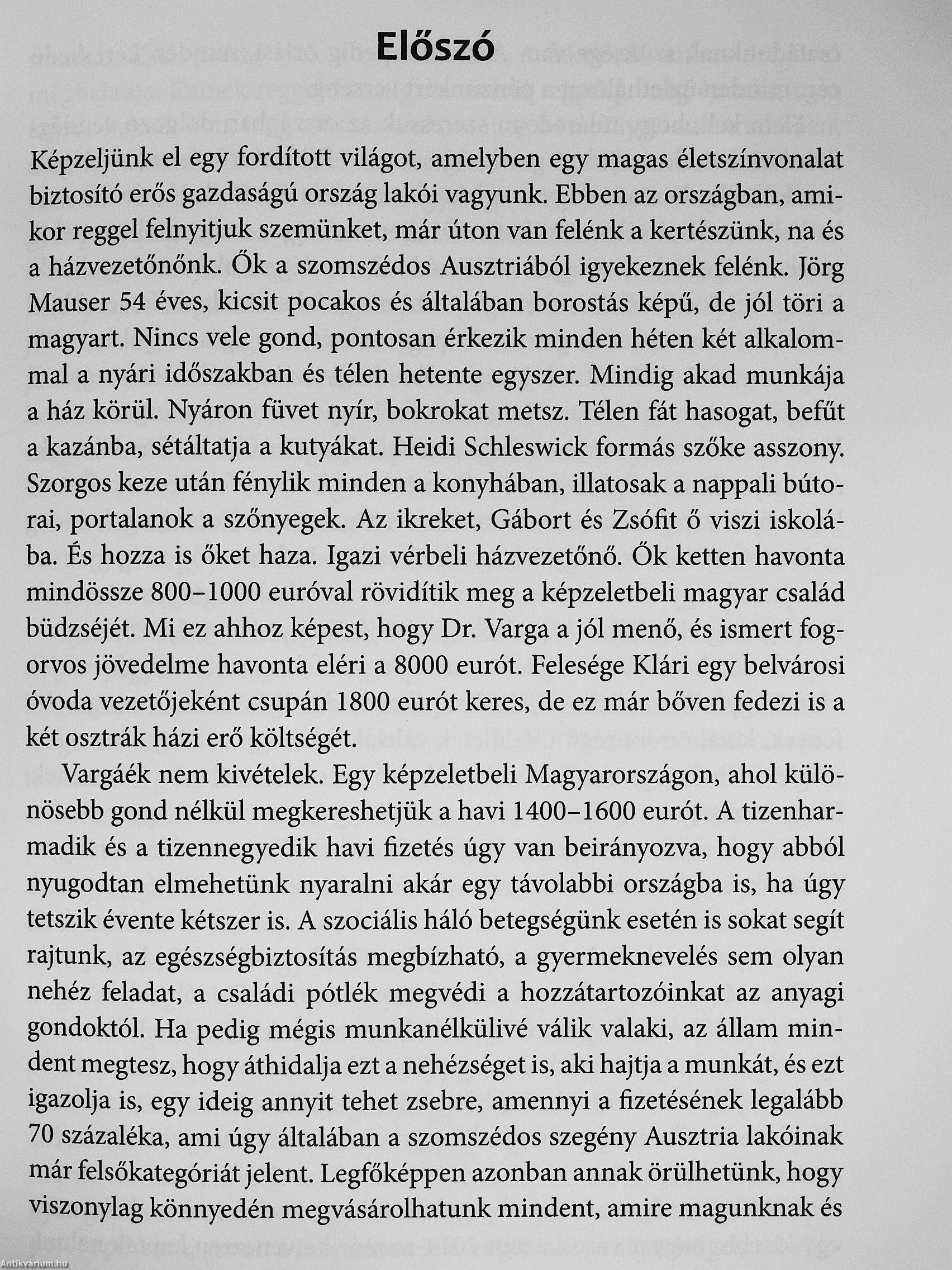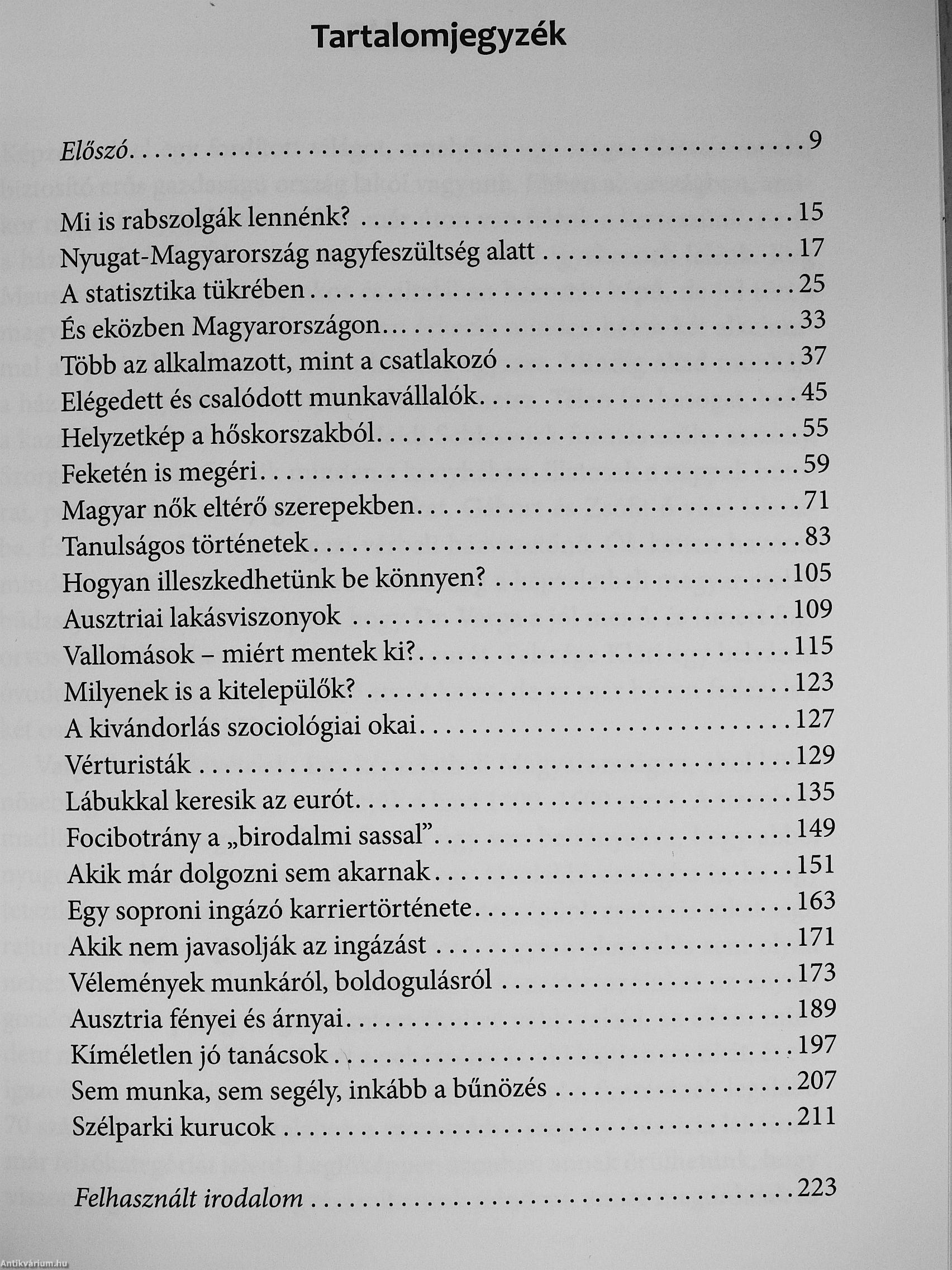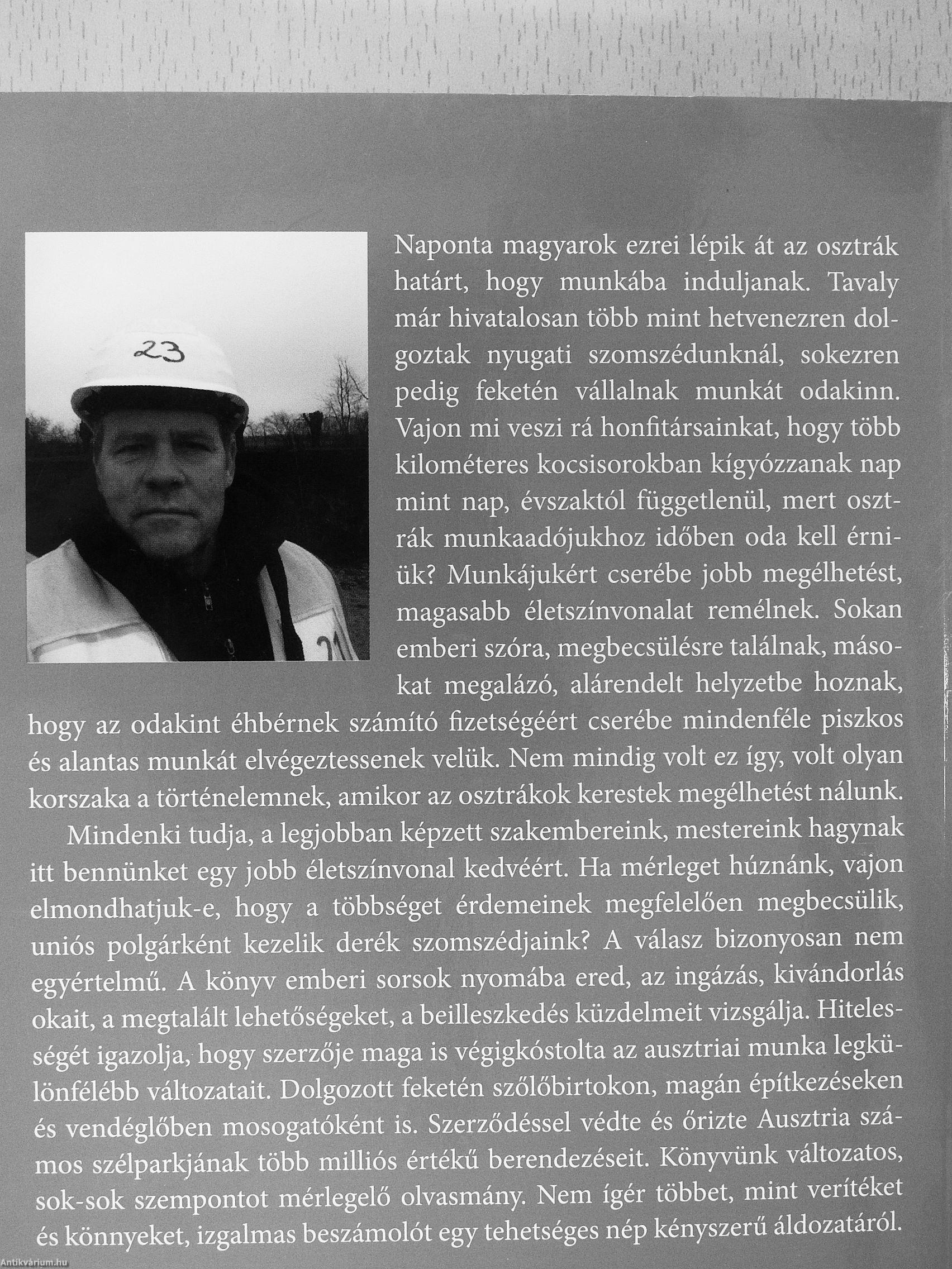 Mindenki tudja, a legjobban képzett szakembereink, mestereink hagynak itt bennünket egy jobb életszínvonal kedvéért. Ha mérleget húznánk, vajon elmondhatjuk-e, hogy a többséget érdemeinek megfelelően megbecsülik, uniós polgárként kezelik derék szomszédjaink? A válasz bizonyosan nem egyértelmű. A könyv emberi sorsok nyomába ered, az ingázás, kivándorlás okait, a megtalált lehetőségeket, a beilleszkedés küzdelmeit vizsgálja. Hitelességét igazolja, hogy szerzője maga is végigkóstolta az ausztriai munka legkülönfélébb változatait. Dolgozott feketén szőlőbirtokon, magán építkezéseken és vendéglőben mosogatóként is. Szerződéssel védte és őrizte Ausztria számos szélparkjának több milliós értékű berendezéseit. Könyvünk változatos, sok-sok szempontot mérlegelő olvasmány. Nem ígér többet, mint verítéket és könnyeket, izgalmas beszámolót egy tehetséges nép kényszerű áldozatáról.