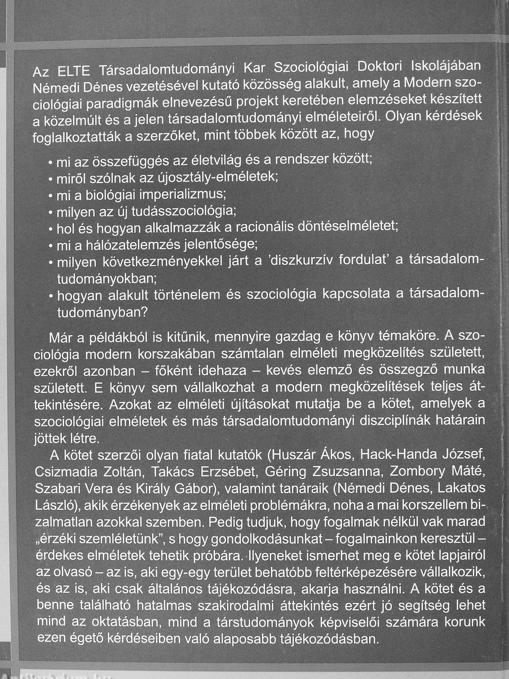 A kötet szerzői olyan fiatal kutatók (Huszár Ákos, Hack-Handa József, Csizmadia Zoltán, Takács Erzsébet, Géring Zsuzsanna, Zombory Máté, Szabari Vera és Király Gábor), valamint tanáraik (Némedi Dénes, Lakatos László), akik érzékenyek az elméleti problémákra, noha a mai korszellem bizalmatlan azokkal szemben. Pedig tudjuk, hogy fogalmak nélkül vak marad „érzéki szemléletünk", s hogy gondolkodásunkat-fogalmainkon keresztül -érdekes elméletek tehetik próbára. Ilyeneket ismerhet meg e kötet lapjairól az olvasó - az is, aki egy-egy terület behatóbb feltérképezésére vállalkozik, és az Is, aki csak általános tájékozódásra, akarja használni. A kötet és a benne található hatalmas szakirodalmi áttekintés ezért jó segítség lehet mind az oktatásban, mind a társtudományok képviselői számára korunk ezen égető kérdéseiben való alaposabb tájékozódásban.