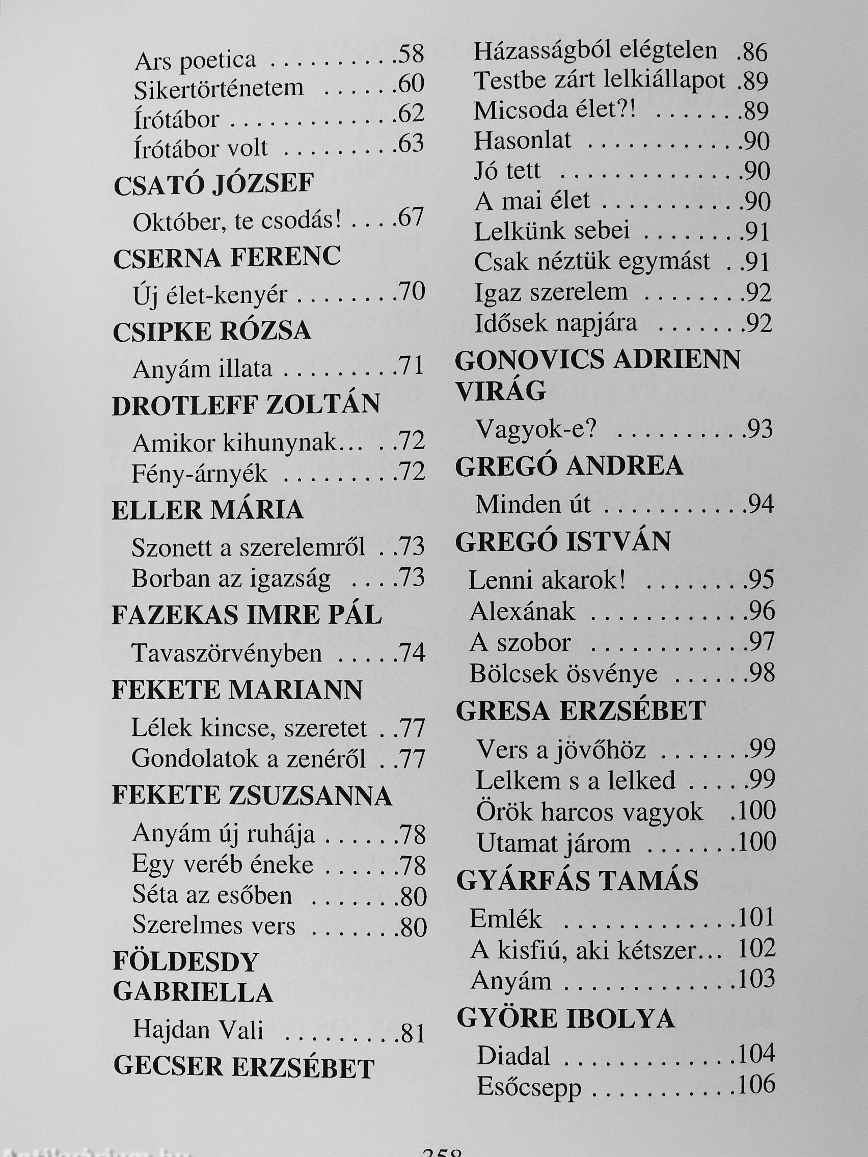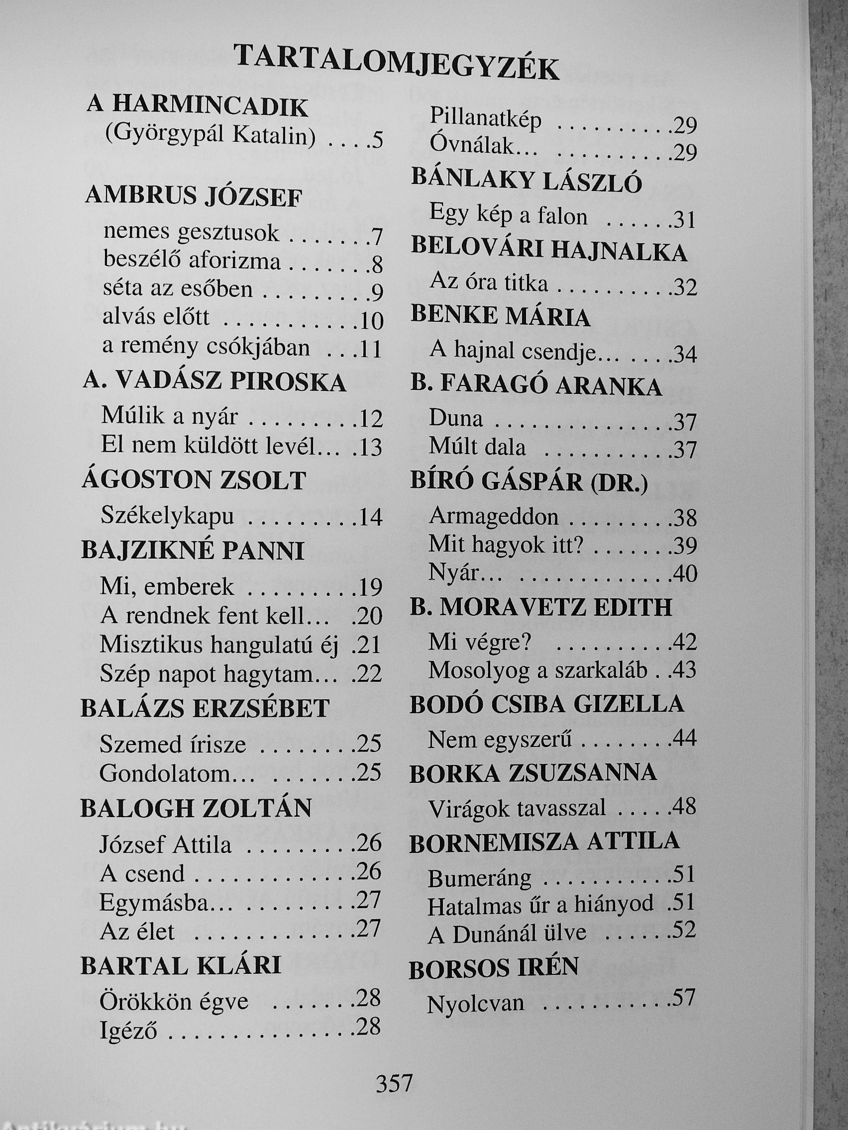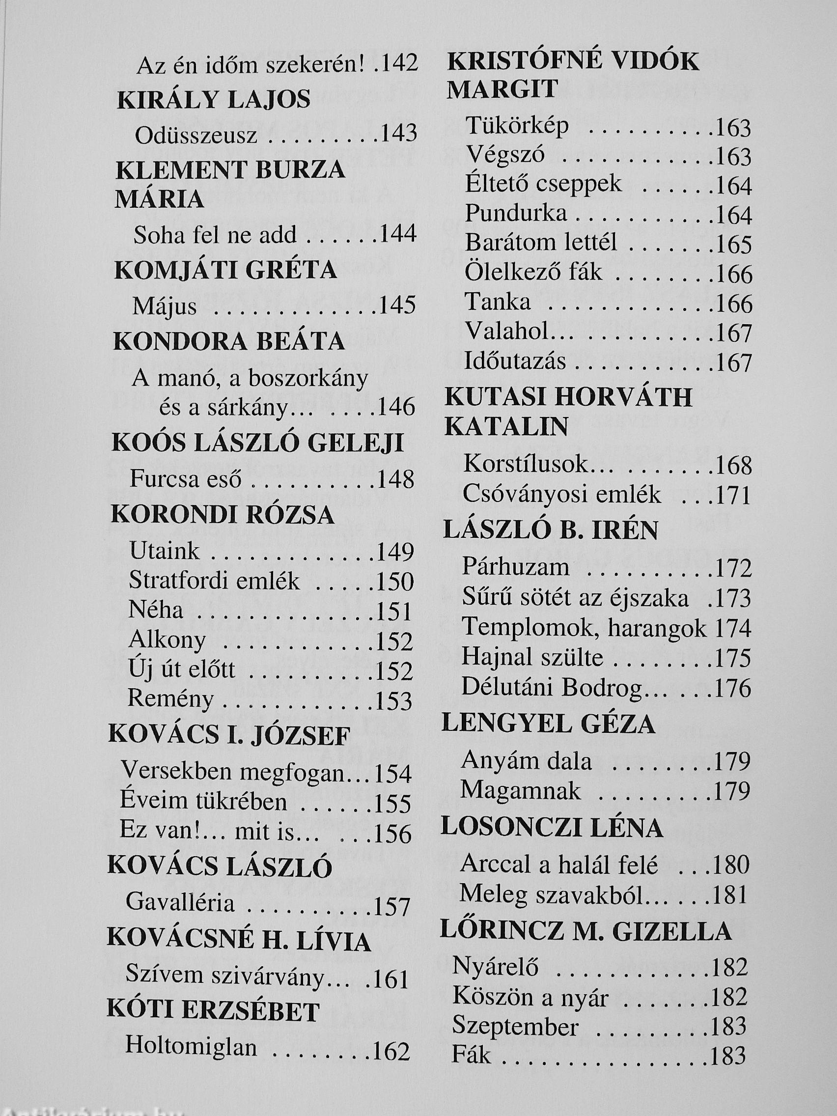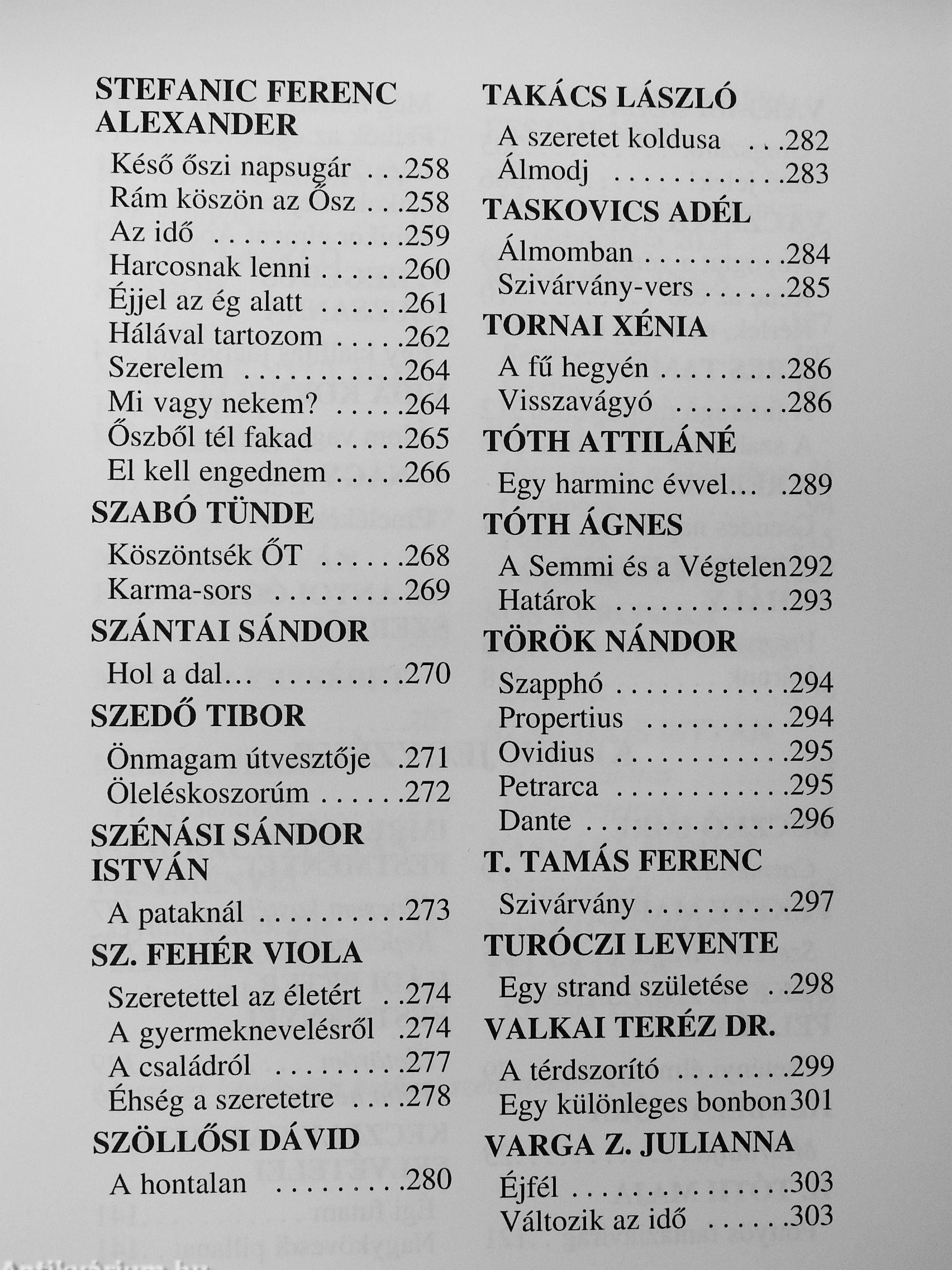 A műveket a szerzők abc-sorrendjében találjuk, kivéve a képzőművészeti alkotásokat, utóbbiak alkotóinak nevei a tartalomjegyzékben szintén abc-sorrendben találhatók. A kötetet most is a szerzők fényképe és néhány soros életrajza záija.