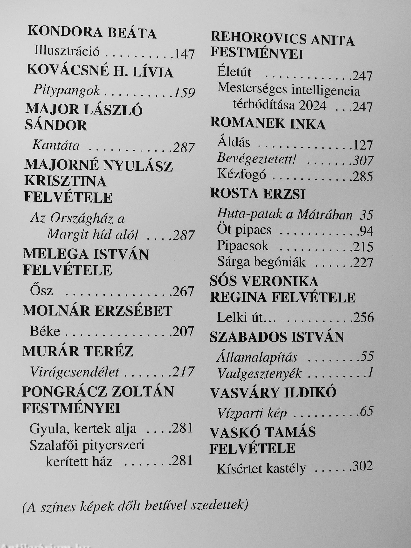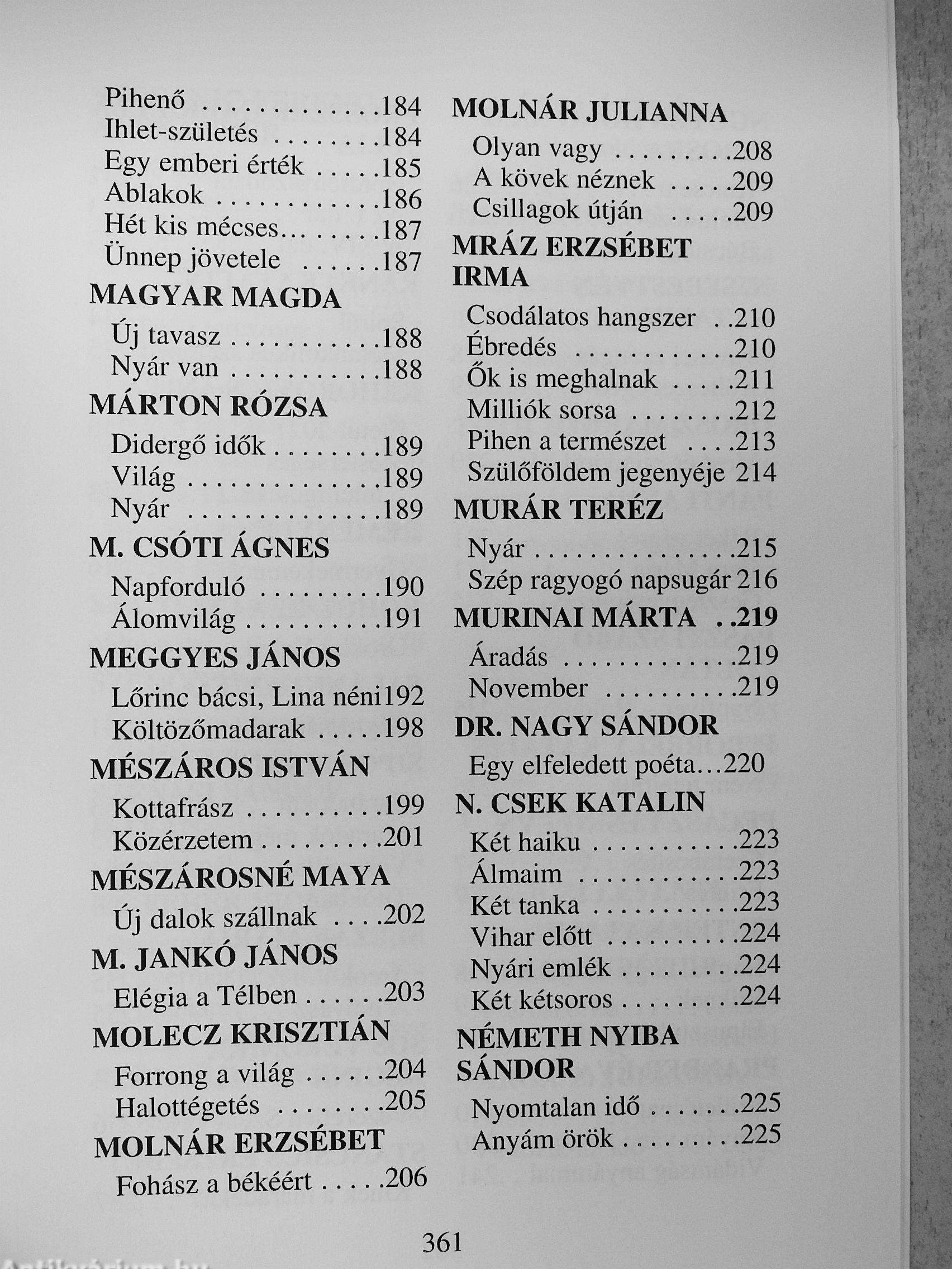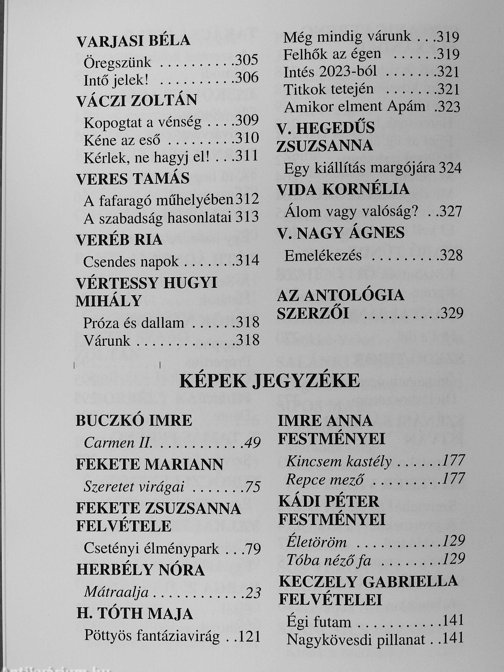 Mostani antológiánkban 9 új szerzőt találunk, közülük kerül ki a legfiatalabb 17 évesen a 139 író-költő-festőművész közül. Örülünk az újaknak is, megbecsüljük, értékeljük, elis-meijük a korábban már publikálókat is.