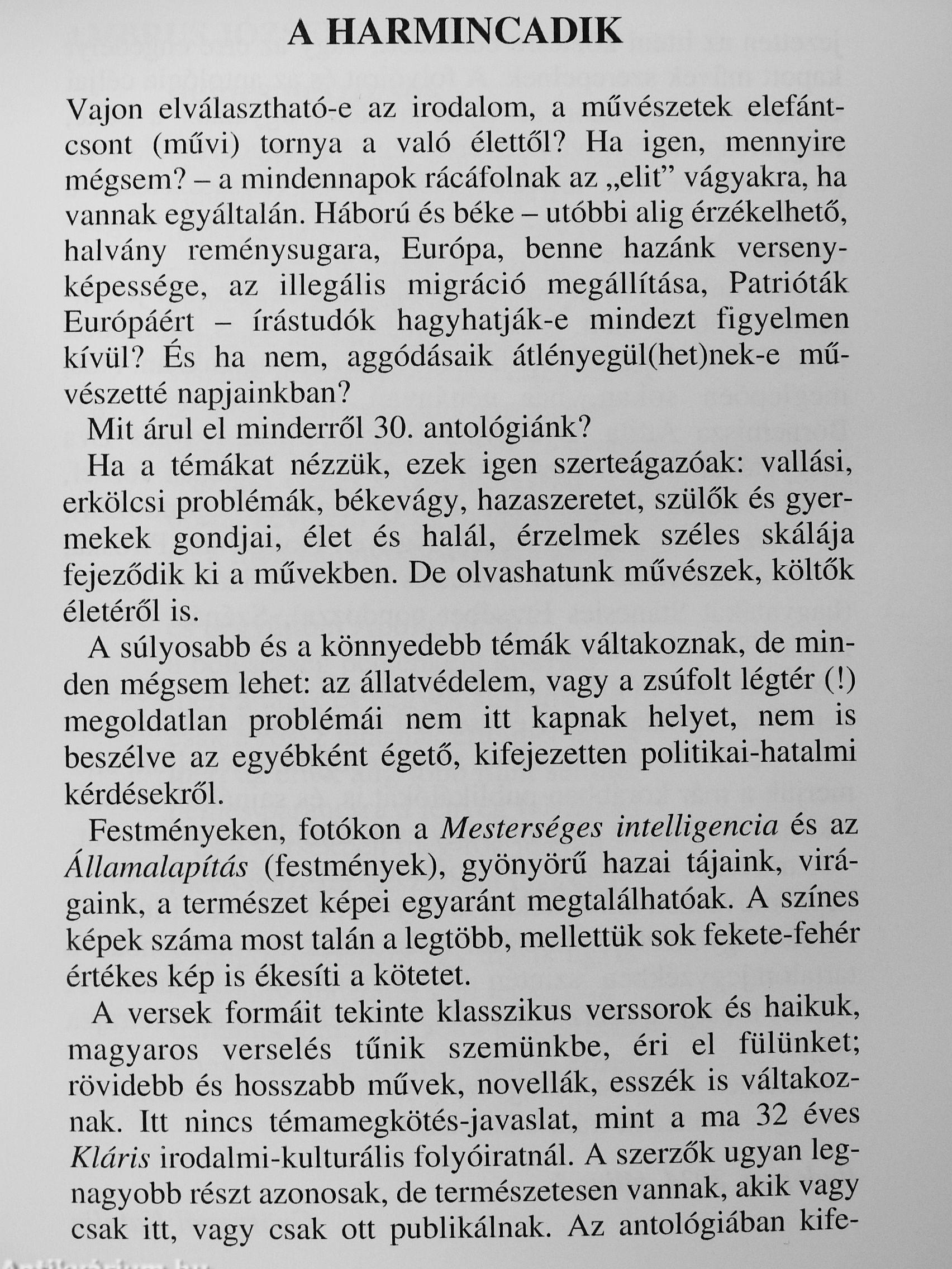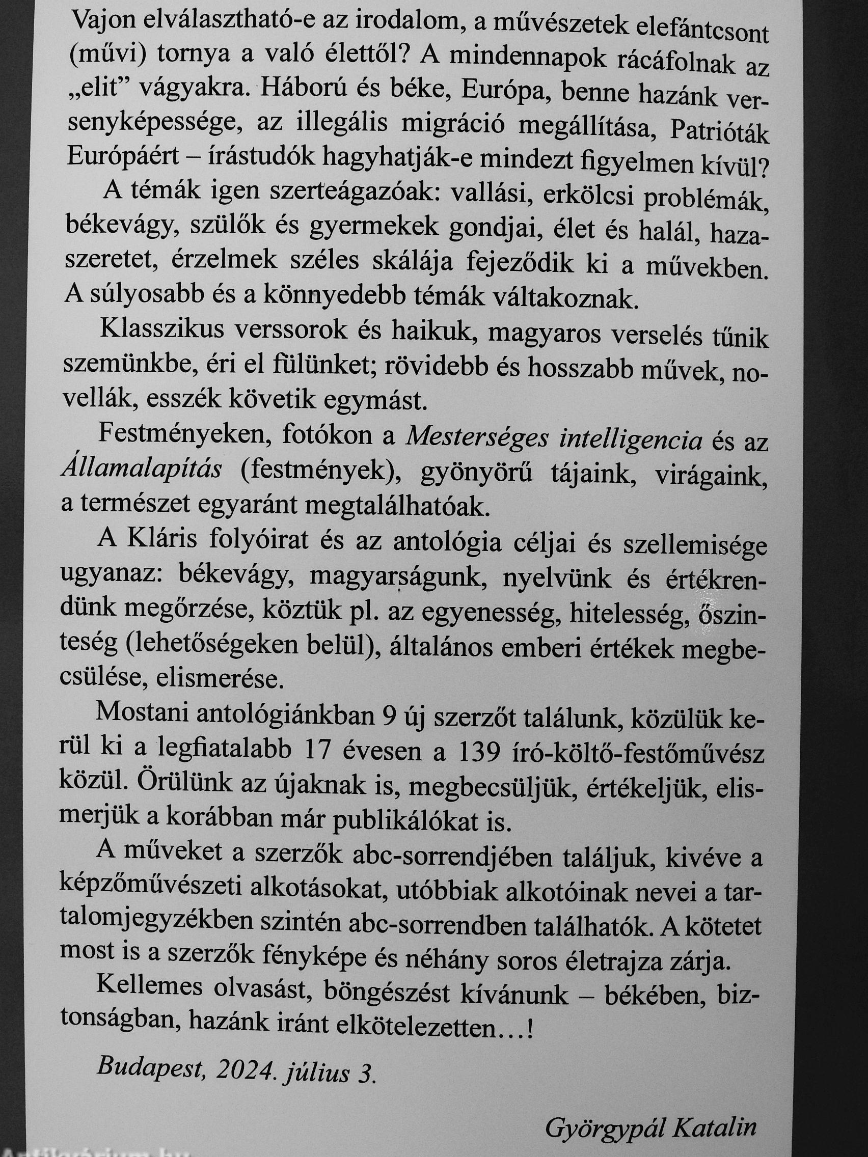 A Kláris folyóirat és az antológia céljai és szellemisége ugyanaz: békevágy, magyarságunk, nyelvünk és értékrendünk megőrzése, köztük pl. az egyenesség, hitelesség, őszinteség... Tovább