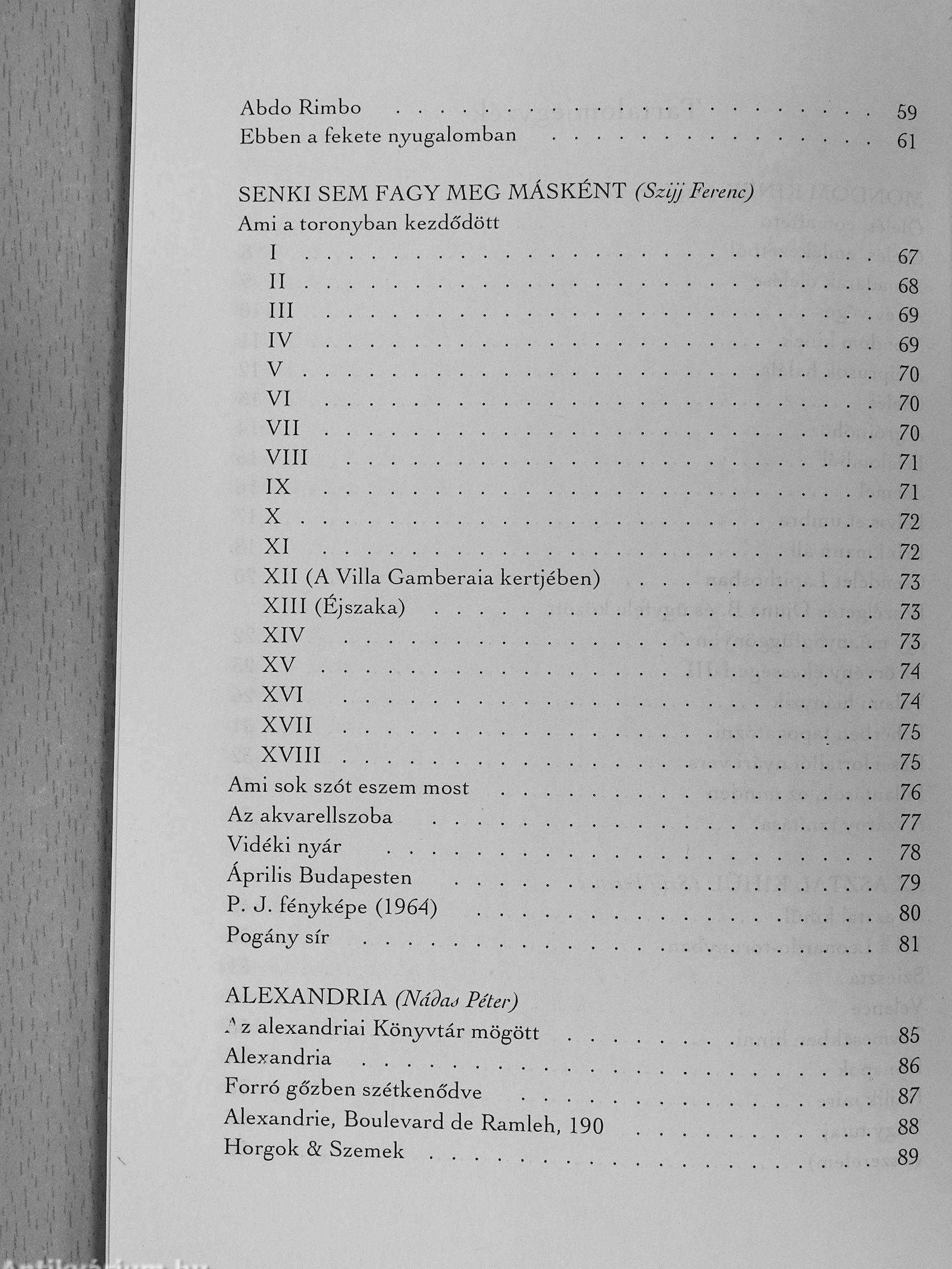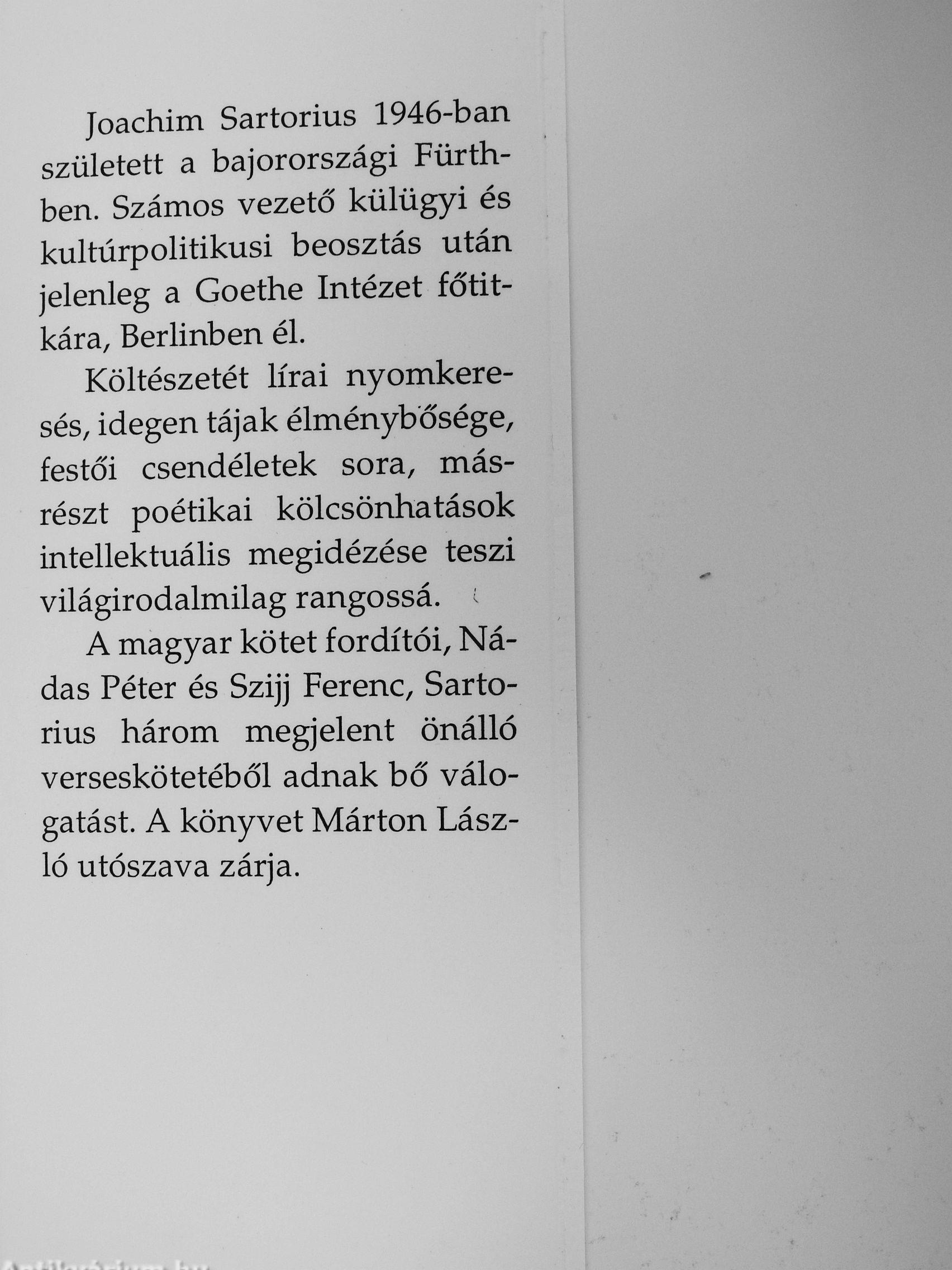 A magyar kötet fordítói. Nádas Péter és Szijj Ferenc, Sartorius három megjelent önálló verseskötetéből adnak bő válogatást. A könyvet Márton László utószava zárja.