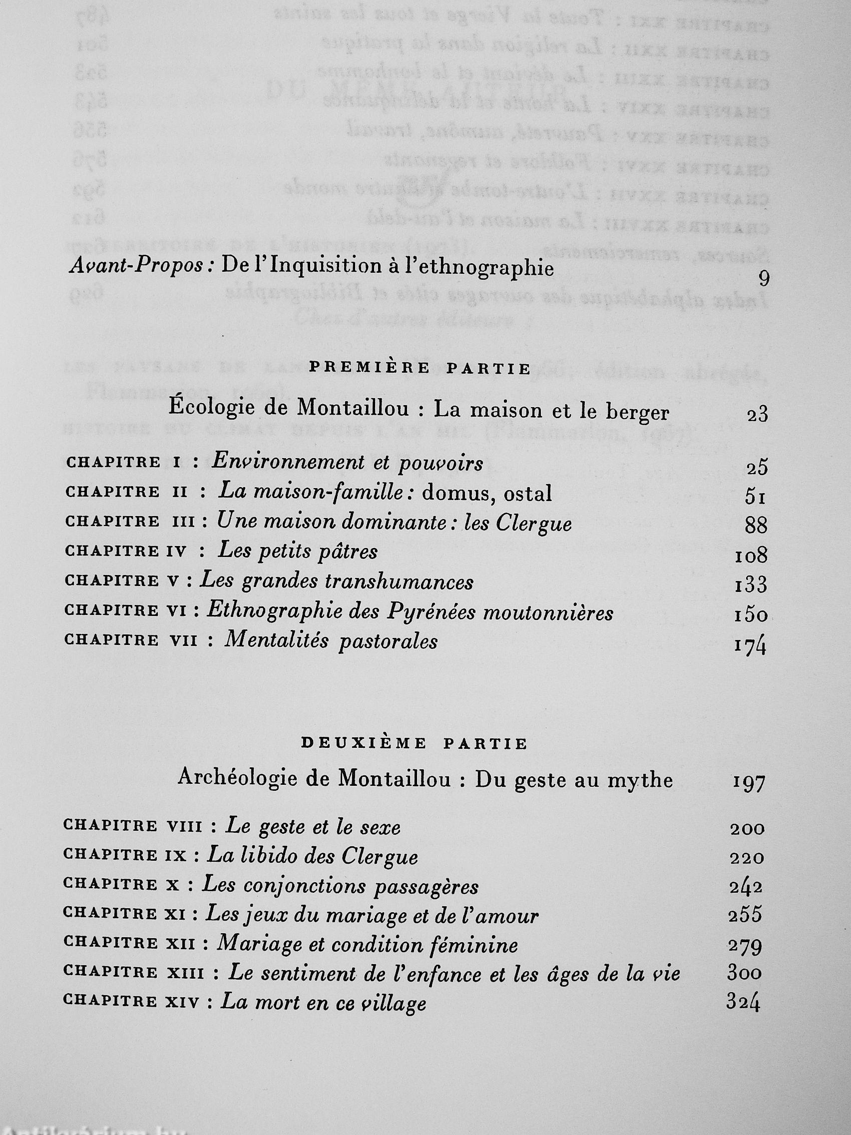 Mais ce sont aussi les drames et la vie quotidienne de Montaillou, opprimé par un clergé dominateur et par le clan tyrannique des Clergue qui forment la trame de cette étude a la fois monographique et globale ; l'enfance et la mort, la culture et la famille, les luttes des maffias paysannes, l'obsession du salut et la magie, l'irréligion et l'hérésie rustiques, la morale et le crime, le folklore, les mythes et les revenants.