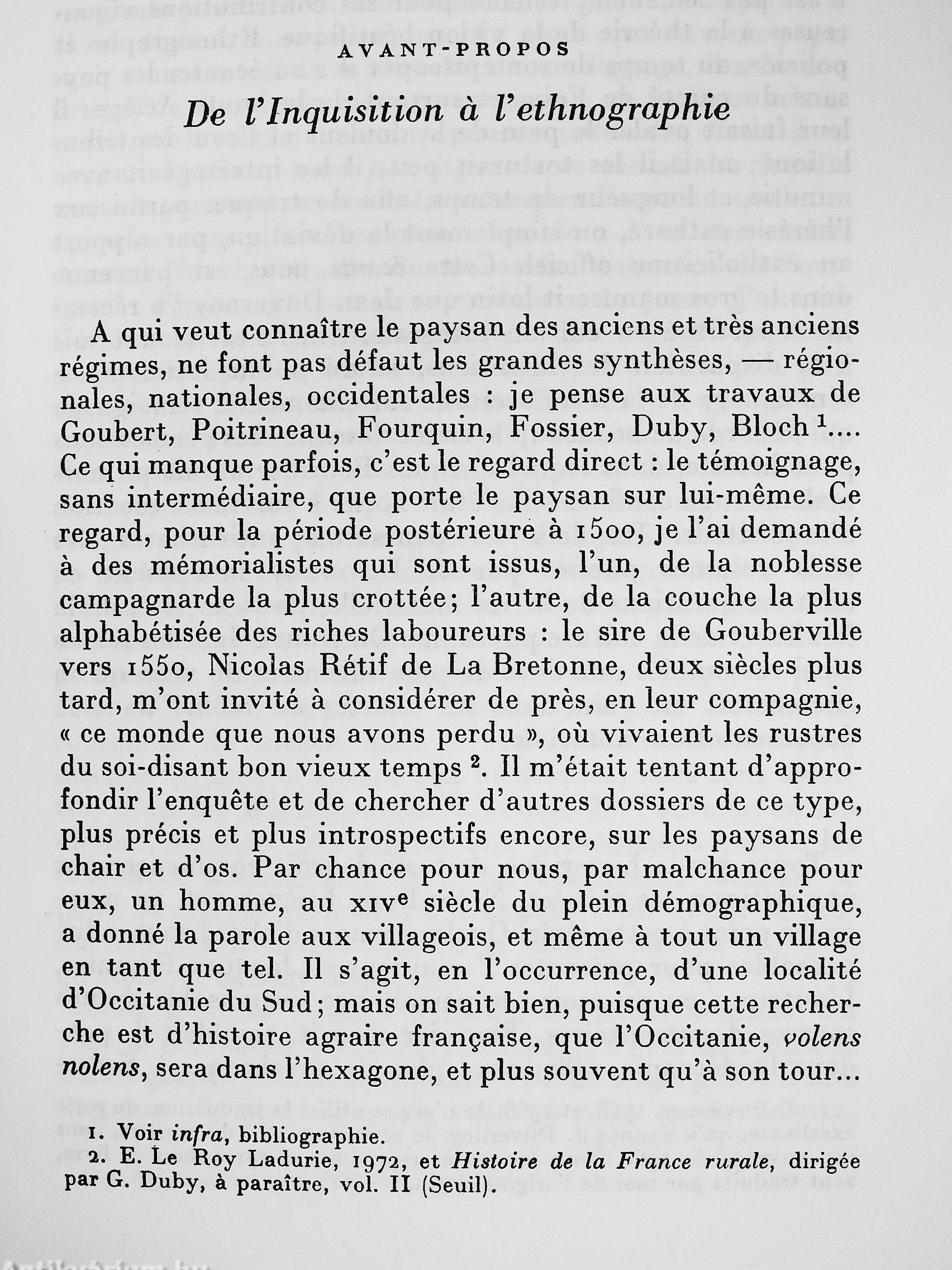 Eu 1320, Jacques Fournier, éveqiie (le ramiers, plus tard pape d'Avignon, ciiqucle comme inquisiteur sur un village de Haute Ariege a 1 300 metres d'altitude : Montaillou, 250 habitants, petite communauté occitane et pyrénéenne de montagnards et de bergers.
