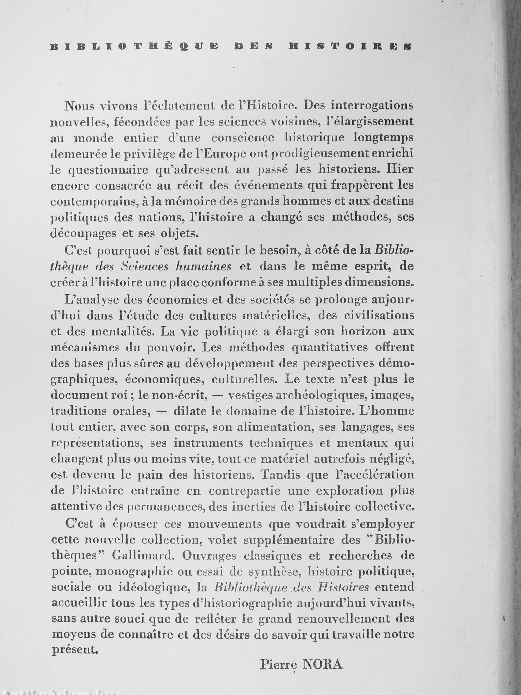 C'est a épouser ces mouvements que voudrait s'employer cette nouvelle collection, volet supplémentaire des "Bibliotheques" Gallimard. Ouvrages classiques et recherches de pointe, monographie ou essai de synthese, histoire politique, sociale ou idéologique, la Bibliotheque des Histoires entend accueillir tous les types d'historiographie aujourd'hui vivants, sans autre souci que de refléter le grand renouvellement des moyens de connaître et des désirs de savoir qui travaille notre présent.