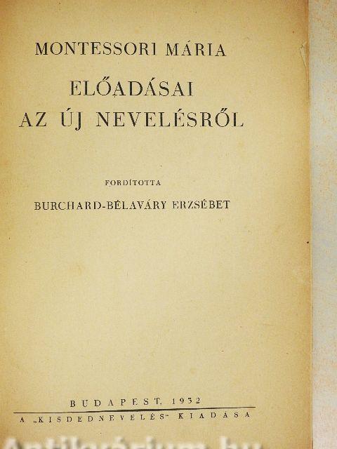 | Megjegyzés: | Az 5 első előadást Montessori 1922-ben tartotta Bruxelles-ben a Pedagógiai Héten és a La femme belge c. folyóirat közölte őket 1922-ben és 1923-ban. Az utolsót az Uj nevelés Ligájának meghivására 1931. április 2-án tartotta a párizsi egyetemen. A Dunántól Pécsi Egyetemi Könyvkiadó és Nyomda RT. nyomása, Pécsett. |