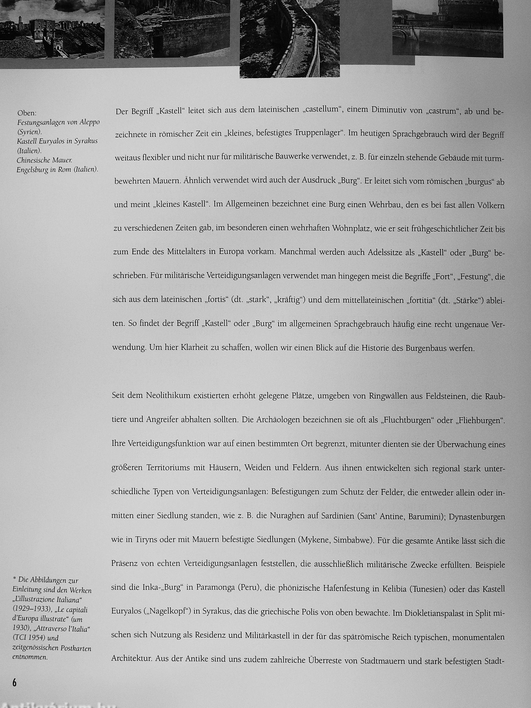 Besondere Aufmerksamkeit gilt den Anlagen in Frankreich und Italien, wo die Baumeister des 12. und 13. Jahrhunderts und in den darauffolgenden 200 Jahren unerreichbare Meister in der Errichtung von Befestigungsarchitekturen waren. Das System der Stadtmauern von Aigues-Mortes, Albi, Carcassonne und Avignon, die Schloß- und Burgmauern von Angers, Vincennes, Château-Gaillard, Gisors, Lassay, Pontivy oder La Roche-Gyon waren für Angreifer nahezu unüberwindliche Hindernisse und faszinieren noch heute durch ihre imposante Architektur. In den brillanten Luftaufnahmen aufersteht das Erbe einer längst vergangenen Zeit und durch die ungewöhnliche Perspektive