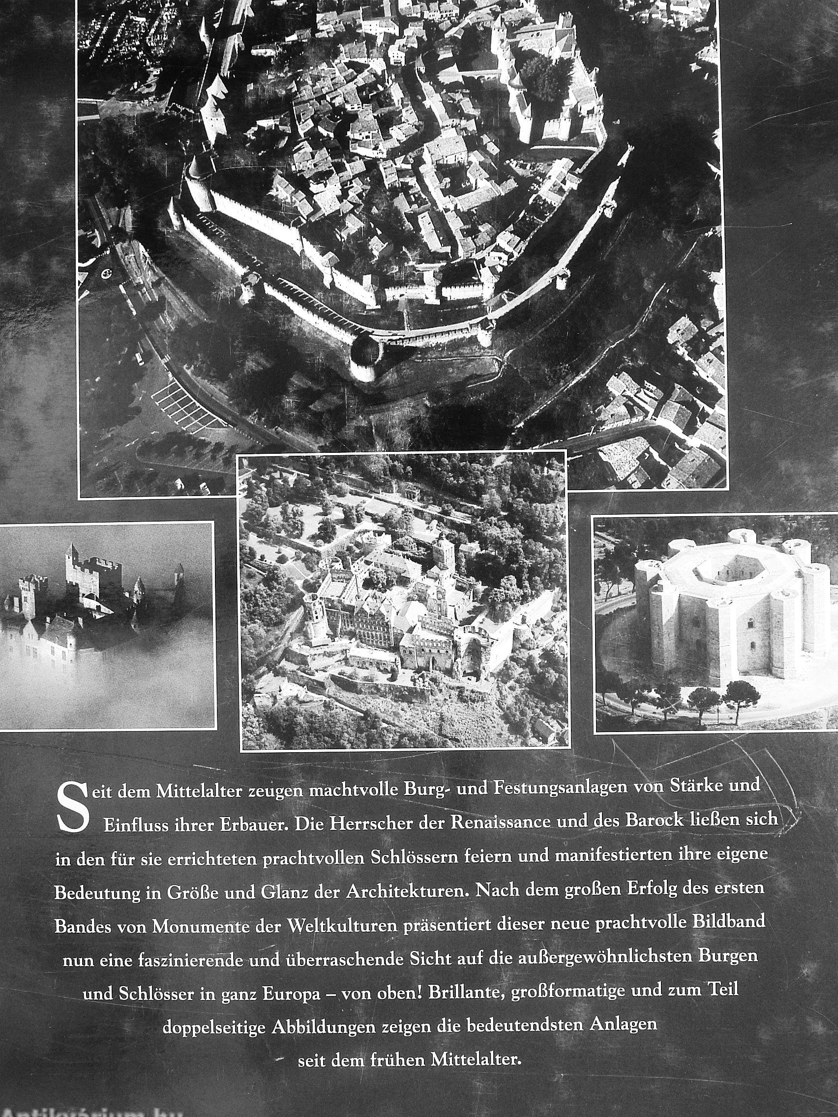 Ebenso erstrahlen die wichtigsten Burgen, Schlösser und Festungen Deutschlands, darunter Heidelberg, Spaniens und Portugals im einzigartigen Panorama der Perspektiven aus der Luft. Noch heute fesselt die Vielfalt der architektonischen Formen, die Intelligenz der Befestigungsanlagen, die Schönheit der alten Städte und ihrer mächtigen Stadteinfriedungen und vor allem die Präsenz der Donjons, der Festungen und der Burg- und Schlossanlagen und ihrer Wehrtürme und Wälle, die damals wie heute über die Ebenen, Täler und Flüsse Europas wachen.