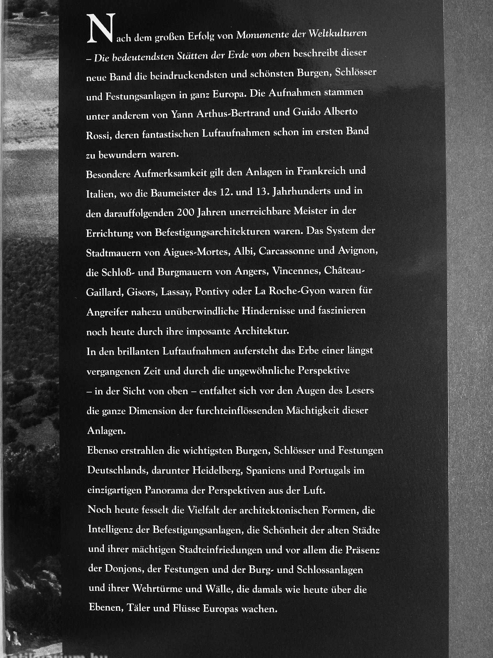 - Die bedeutendsten Stätten der Erde von oben beschreibt dieser neue Band die beindrucicendsten und schönsten Burgen, Schlösser und Festungsanlagen in ganz Europa. Die Aufnahmen stammen unter anderem von Yann Arthus-Bertrand und Guido Alberto Rossi, deren fantastischen Luftaufnahmen schon im ersten Band zu bewundern waren.