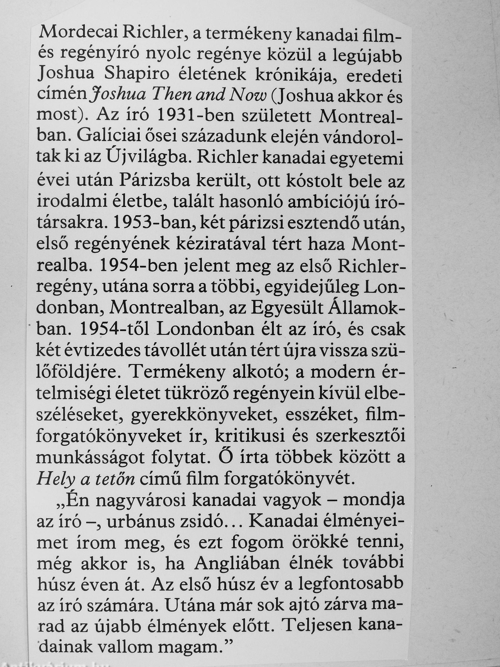 Mordecai Richler, a termékeny kanadai film-és regényíró nyolc regénye közül a legújabb Joshua Shapiro életének krónikája, eredeti cimén Joshua Then and Now (Joshua akkor és most). Az író 1931-ben született Montrealban. Galíciai ősei századunk elején vándoroltak ki az Újvilágba. Richler kanadai egyetemi évei után Párizsba került, ott kóstolt bele az irodalmi életbe, talált hasonló ambíciójú írótársakra. 1953-ban, két párizsi esztendő után, első regényének kéziratával tért haza Mont-realba. 1954-ben jelent meg az első Richler-regény, utána sorra a többi, egyidejűleg Londonban, Montrealban, az Egyesült Államokban. 1954-től Londonban élt az író, és csak két évtizedes távollét után tért újra vissza szülőföldjére. Termékeny alkotó; a modern értelmiségi életet tükröző regényein kívül elbeszéléseket, gyerekkönyveket, esszéket, filmforgatókönyveket ír, kritikusi és szerkesztői munkásságot folytat. Ö írta többek között a Hely a tetőn című film forgatókönyvét.