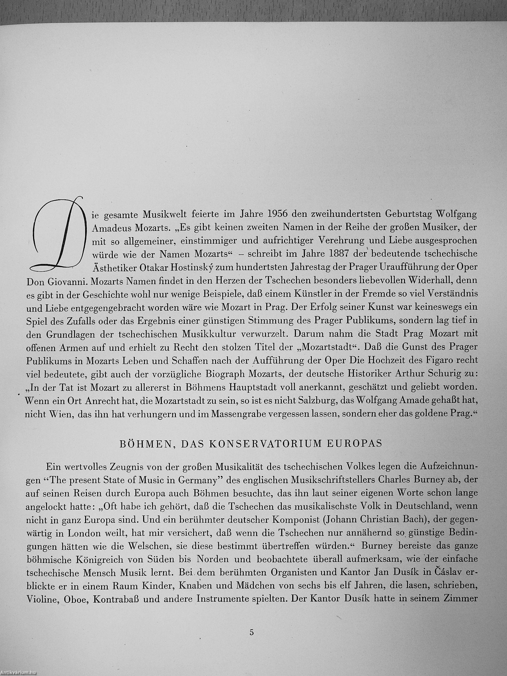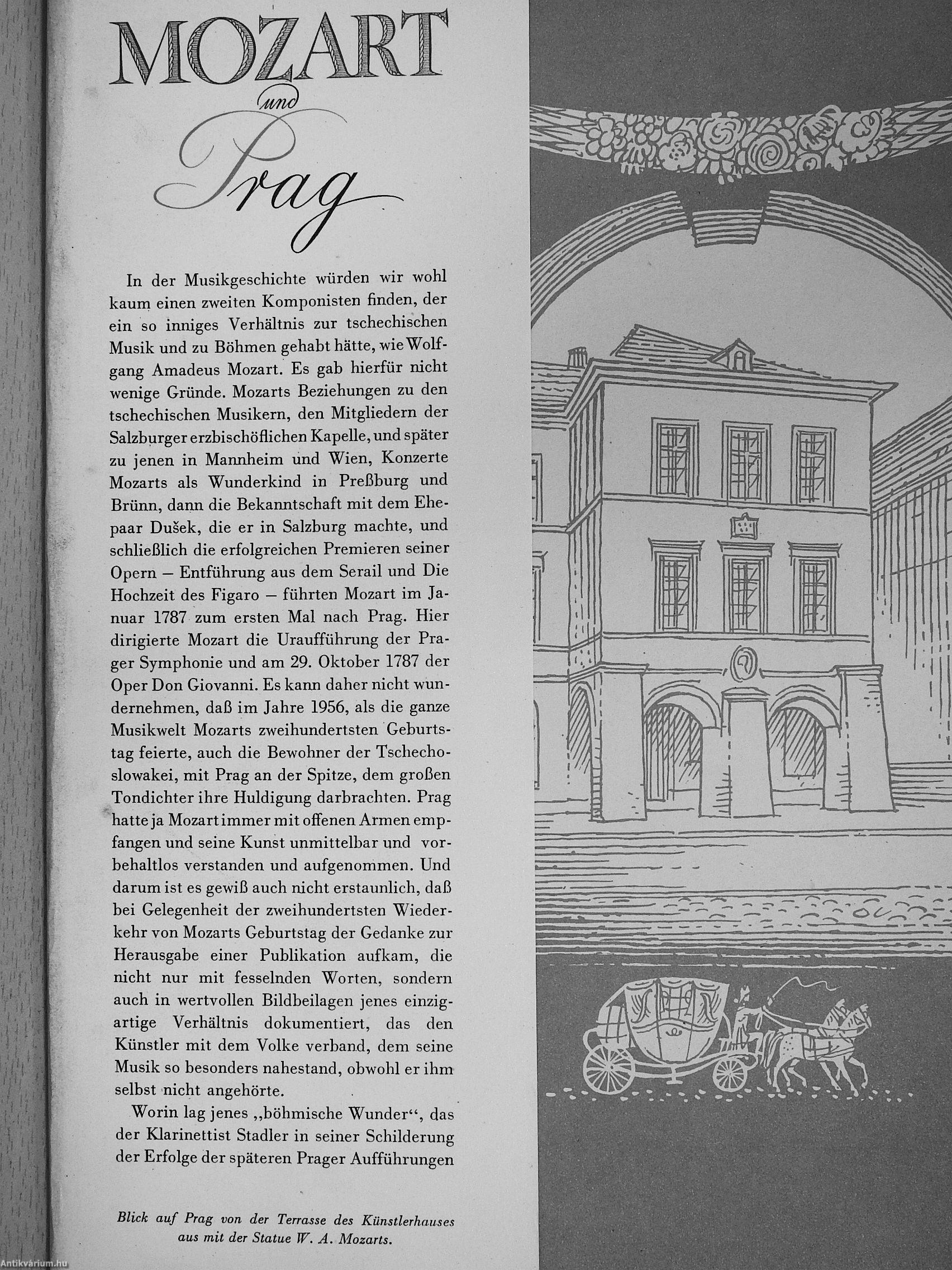 In der Musikgeschichte würden wir wohl kaum einen zweiten Komponisten finden, der ein so inniges Verhältnis zur tschechischen Musik und zu Böhmen gehabt hätte, wie Wolfgang Amadeus Mozart. Es gab hierfür nicht wenige Gründe. Mozarts Beziehungen zu den tschechischen Musikern, den Mitghedern der Salzburger erzbischöflichen Kapelle, und später zu jenen in Mannheim und Wien, Konzerte Mozarts als Wunderkind in Preßburg und Brünn, dann die Bekanntschaft mit dem Ehepaar Dusek, die er in Salzburg machte, und schließlich die erfolgreichen Premieren seiner Opern — Entführung aus dem Serail und Die Hochzeit des Figaro - führten Mozart im Januar 1787 zum ersten Mal nach Prag. Hier dirigierte Mozart die Urauffühnmg der Prager Symphonie und am 29. Oktober 1787 der Oper Don Giovanni. Es kann daher nicht wundernehmen, daß im Jahre 1956, als die ganze Musikwelt Mozarts zweihundertsten Geburtstag feierte, auch die Bewohner der Tschechoslowakei, mit Prag an der Spitze, dem großen Tondichter ihre Huldigung darbrachten. Prag hatte ja Mozart immer mit offenen Armen empfangen und seine Kunst unmittelbar und vorbehaltlos verstanden und aufgenommen. Und darum ist es gewiß auch nicht erstaunlich, daß bei Gelegenheit der zweihundertsten Wiederkehr von Mozarts Geburtstag der Gedanke zur Herausgabe einer Publikation aufkam, die nicht nur mit fesselnden Worten, sondern auch in wertvollen Bildbeilagen jenes einzigartige Verhältnis dokumentiert, das den Künstler mit dem Volke verband, dem seine Musik so besonders nahestand, obwohl er ihm selbst nicht angehörte.