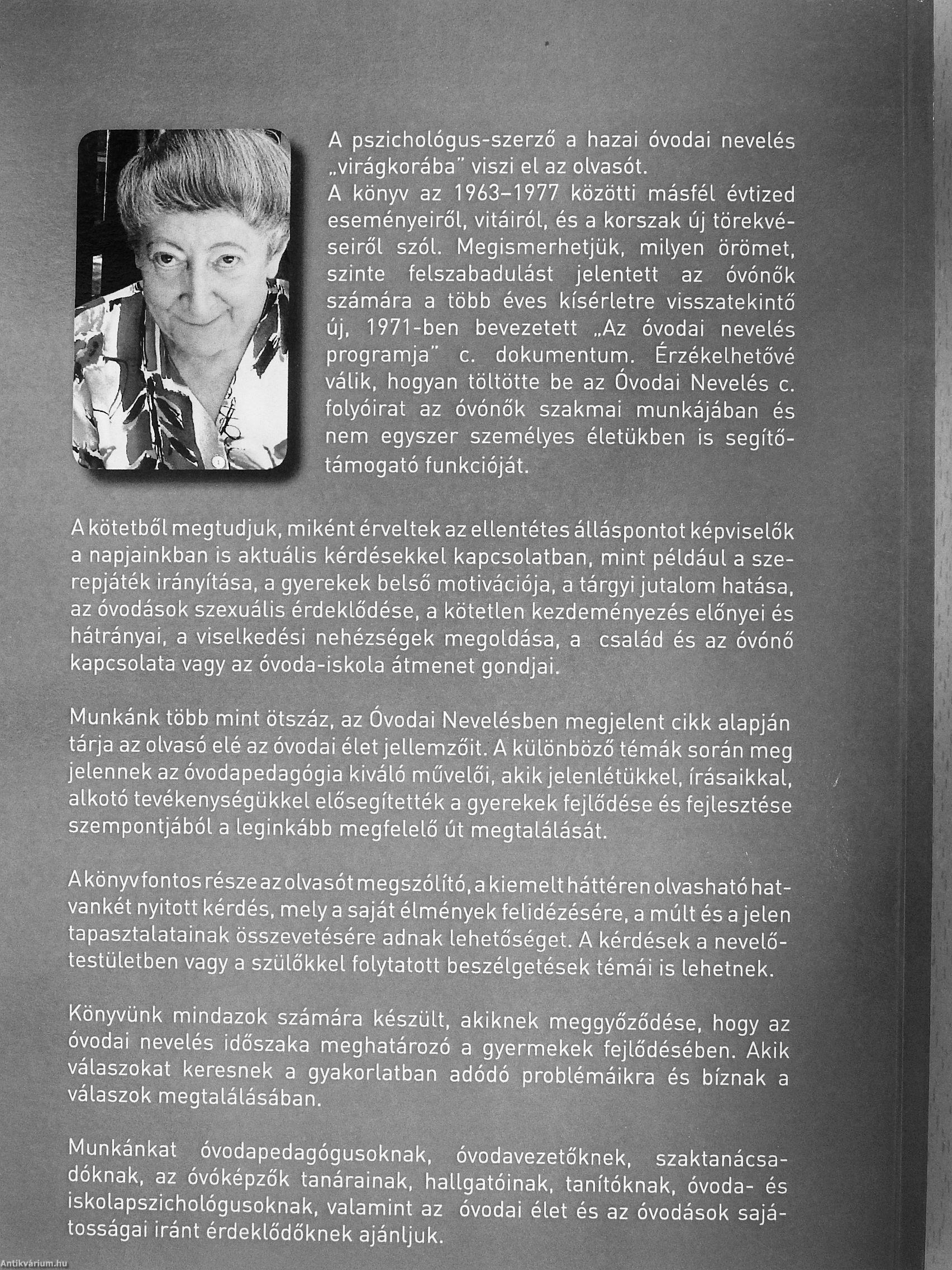 A pszichológus-szerző a hazai óvodai nevelés „virágkorába" viszi el az olvasót. A könyv az 1963-1977 közötti másfél évtized eseményeiről, vitáiról, és a korszak új törekvéseiről szól. Megismerhetjük, milyen örömet, szinte felszabadulást jelentett az óvónők számára a több éves kísérletre visszatekintő ' új, 1971-ben bevezetett „Az óvodai nevelés programja" c. dokumentum. Érzékelhetővé válik, hogyan töltötte be az Óvodai Nevelés c. folyóirat az óvónők szakmai munkájában és nem egyszer személyes életükben is segítőtámogató funkcióját.