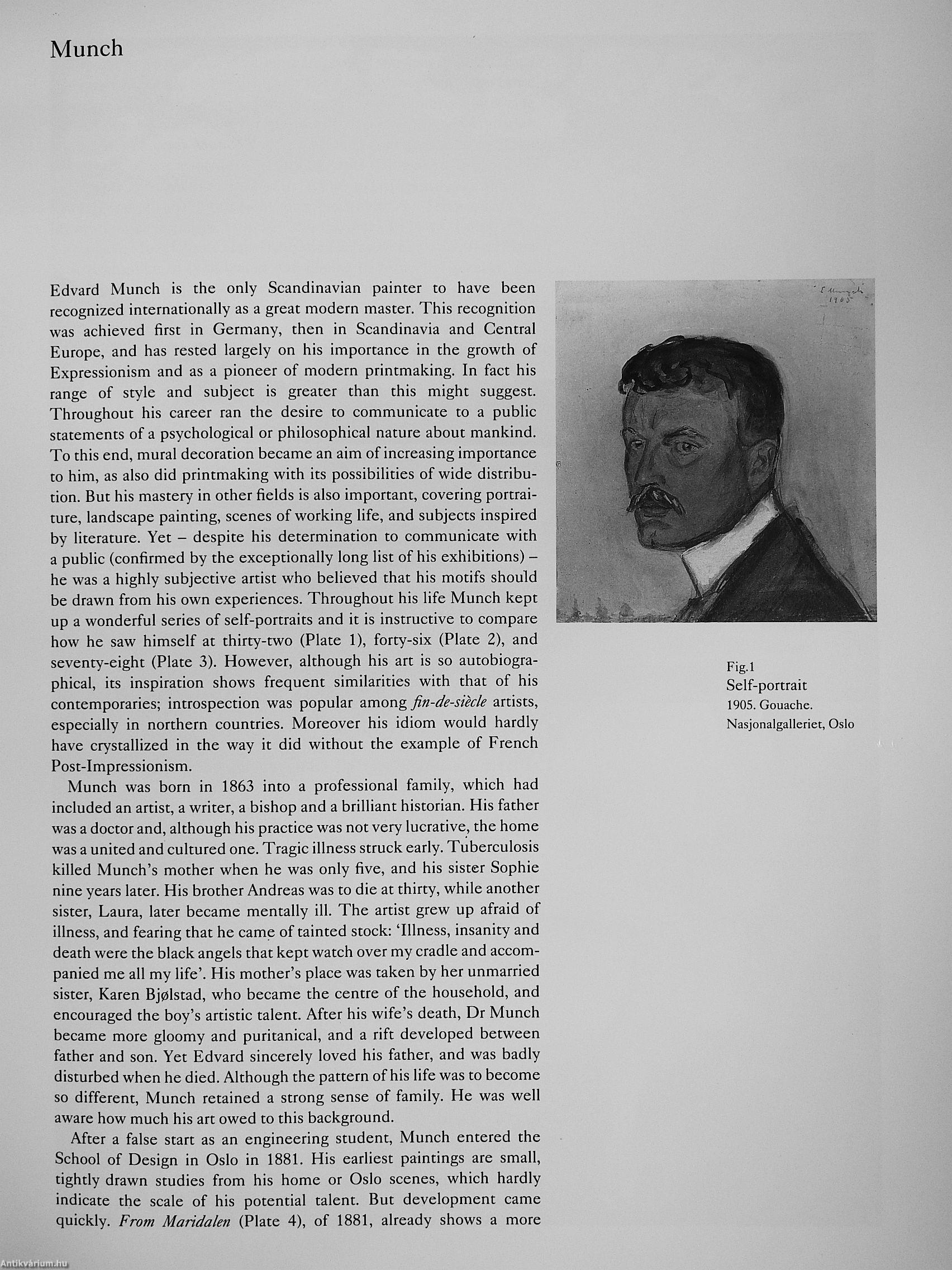 A tragic childhood - his mother died when he was five and a sister when he was thirteen -wounded him deeply, and much of his early work expresses this in its agonized pessimism. In the first half of his career he lived much of his life in Germany, and became one of the fathers of modern German art. After 1900, however, and particularly after his return to Norway in 1909 following a severe nervous breakdown, his subjects tended to become more extrovert and objective, while his palette assumed increasingly brighter colours. The period 1910-20 was a particularly prolific one, in which he painted mural decorations for Oslo University and many other outdoor subjects, but Munch continued working throughout his life and produced some remarkable self-portraits shortly before his death.