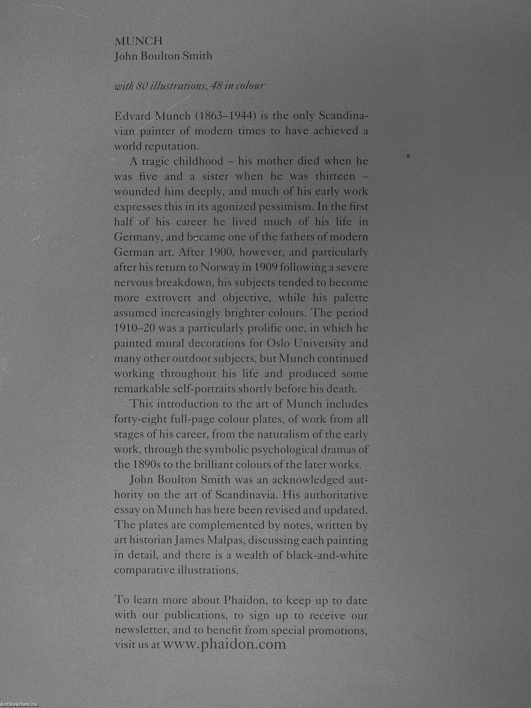 John Boulton Smith was an acknowledged authority on the art of Scandinavia. His authoritative essay on Munch has here been revised and updated. The plates are complemented by notes, written by art historian James Malpas, discussing each painting in detail, and there is a wealth of black-and-white comparative illustrations.