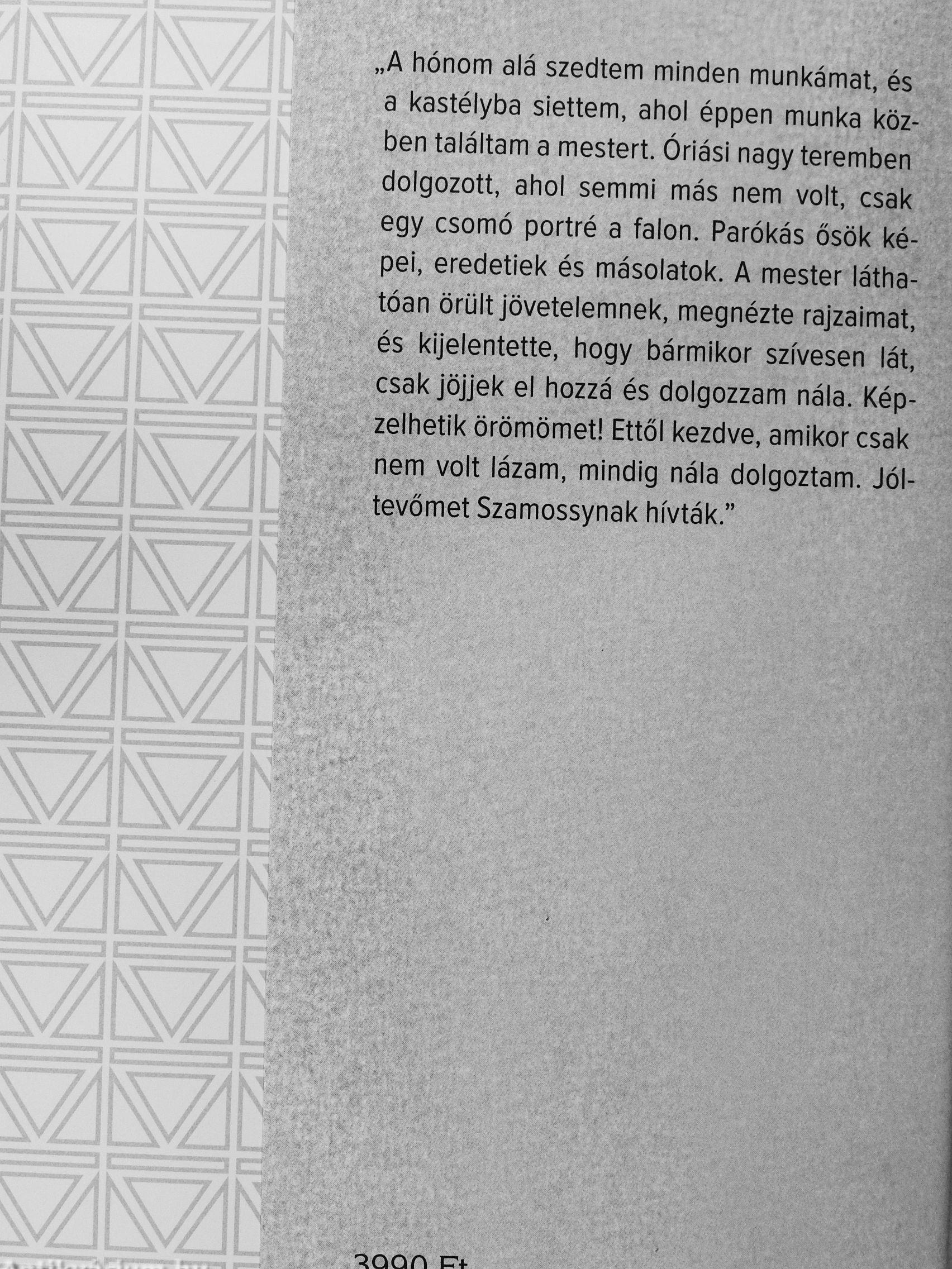 „A hónom alá szedtem minden munkámat, és a kastélyba siettem, ahol éppen munka közben találtam a mestert. Óriási nagyteremben dolgozott, ahol semmi más nem volt, csak egy csomó portré a falon. Parókás ősök képei, eredetiek és másolatok. A mester láthatóan örült jövetelemnek, megnézte rajzaimat, és kijelentette, hogy bármikor szívesen lát, csak jöjjek el hozzá és dolgozzam nála. Képzelhetik örömömet! Ettől kezdve, amikor csak nem volt lázam, mindig nála dolgoztam. Jói-tevőmet Szamossynak hívták."
