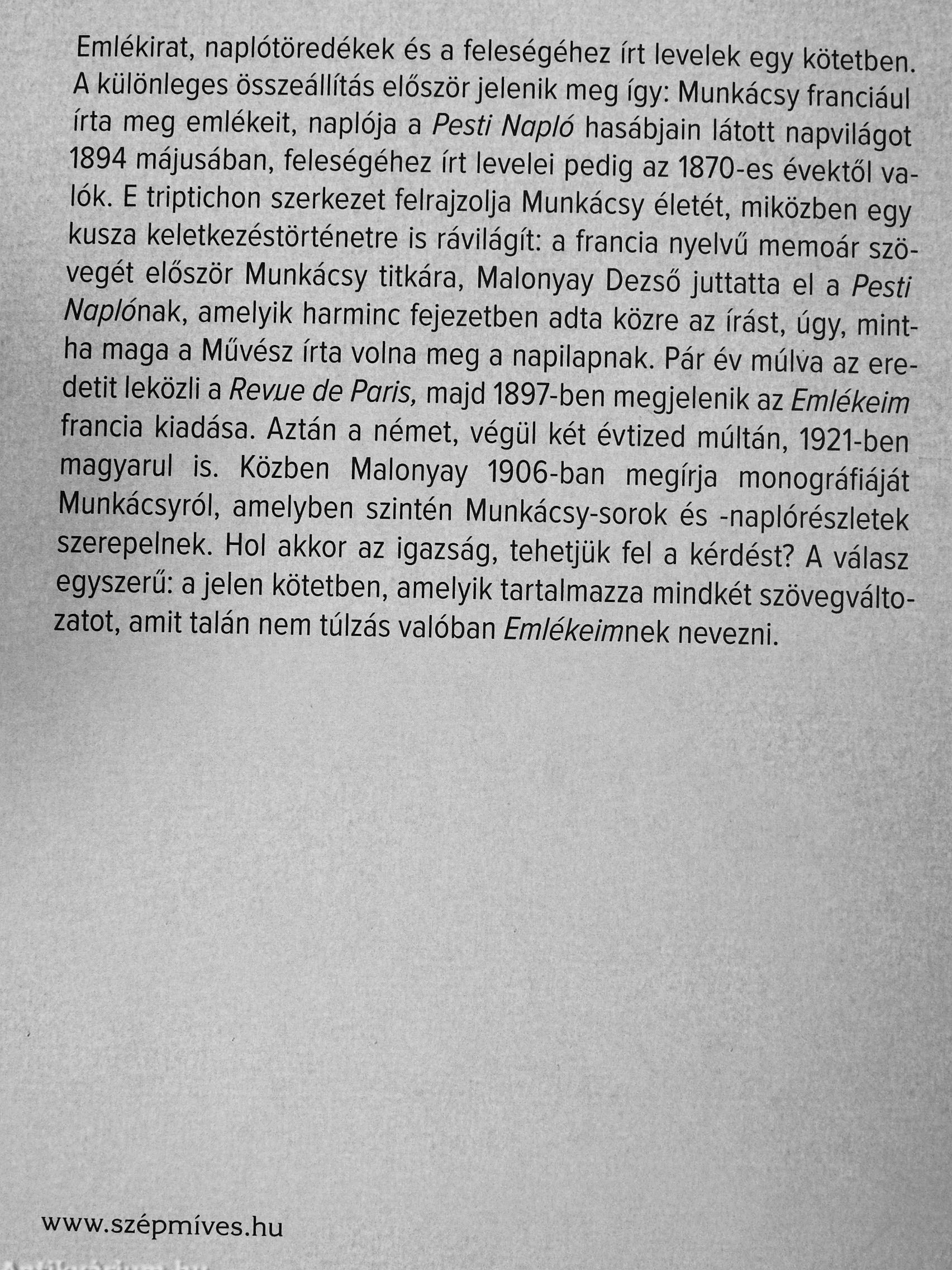 Emlékirat, naplótöredékek és a feleségéhez írt levelek egy kötetben. A különleges összeállítás először jelenik meg így: Munkácsy franciául írta meg emlékeit, naplója a Pesti Napló hasábjain látott napvilágot 1894 májusában, feleségéhez írt levelei pedig az 1870-es évektől valók. E triptichon szerkezet felrajzolja Munkácsy életét, miközben egy kusza keletkezéstörténetre is rávilágít: a francia nyelvű memoár szövegét először Munkácsy titkára, Malonyay Dezső juttatta el a Pesti Naplónak, amelyik harminc fejezetben adta közre az írást, úgy, mintha maga a Művész írta volna meg a napilapnak. Pár év múlva az eredetit leközli a Revve de Paris, majd 1897-ben megjelenik az Emlékeim francia kiadása. Aztán a német, végül két évtized múltán, 1921-ben magyarul is. Közben Malonyay 1906-ban megírja monográfiáját Munkácsyról, amelyben szintén Munkácsy-sorok és -naplórészletek szerepelnek. Hol akkor az igazság, tehetjük fel a kérdést? A válasz egyszerű: a jelen kötetben, amelyik tartalmazza mindkét szövegváltozatot, amit talán nem túlzás valóban Emlékeimnek nevezni.