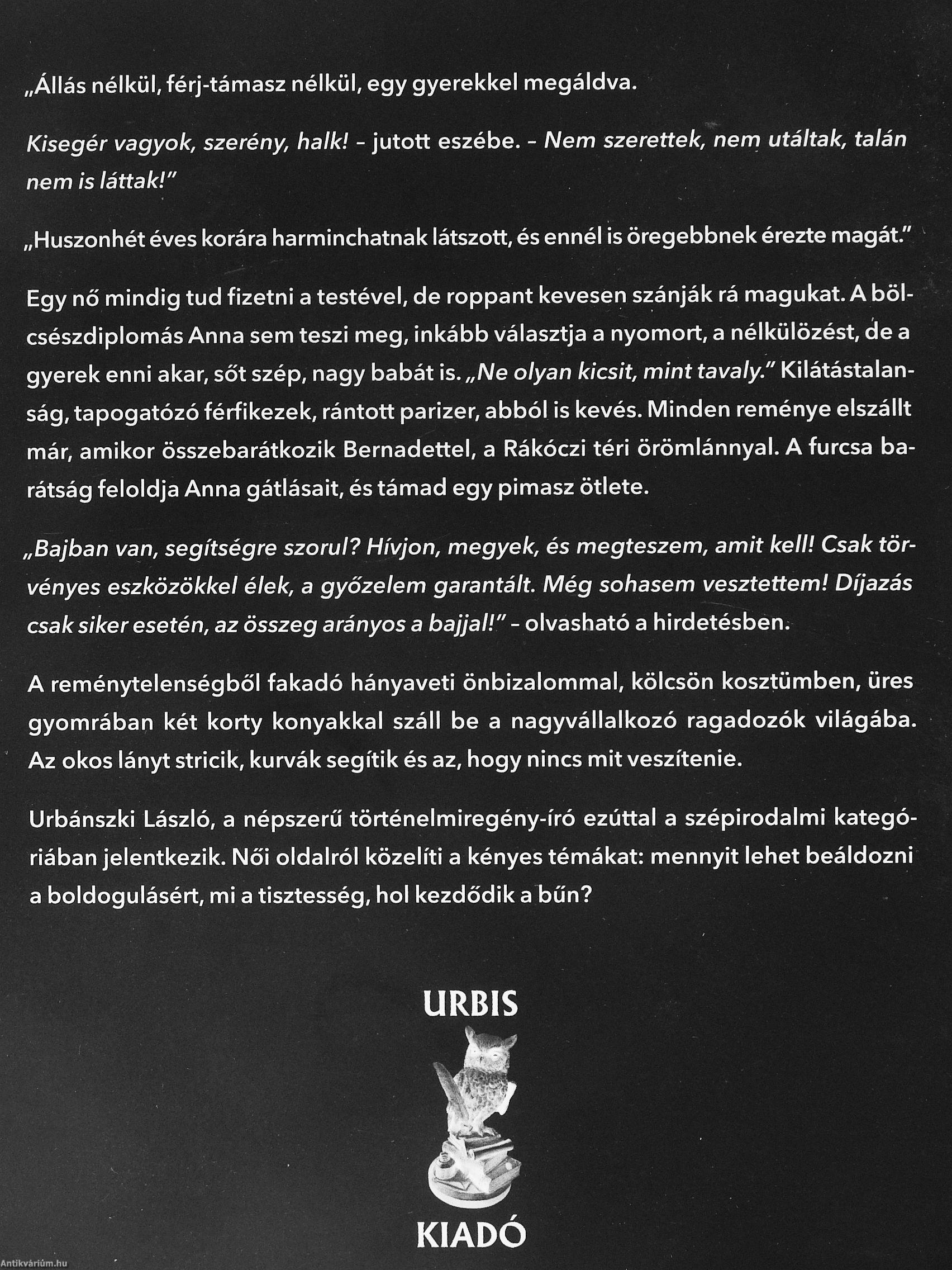Urbánszki László, a népszerű történelmiregény-író ezúttal a szépirodalmi kategóriában jelentkezik. Női oldalról közelíti a kényes témákat: mennyit lehet beáldozni a boldogulásért, mi a tisztesség, hol kezdődik a bűn?
