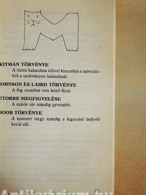 "Ha valami egyáltalán elromolhat, az el is romlik" - erre az alaptételre épül viselkedési törvényeinknek és a ránk hol barátságosan, hol fintorogva visszatekintő világnak az az enciklopédikus összefoglalása - a maga nemében páratlanul ks terjedelemben -, amelyet itt nyújtunk át az olvasónak. Okuljon belőle: főként hogy minden dolognak fonákja is van, s hogy az eshetőségek közül - e fordított leibnizi világszemléletben - többnyire, legalábbis ebben a felfogásban, a legkellemetlenebb következik be, vagy - hogy egy másik alaptételt időzzünk - egyáltalán nincsenek is jobb vagy rosszabb eshetőségek. S ha már kellően áttanulmányoztuk és magunkévá tettük ezt a "hibázni nemcsak lehet, hanem kell is" szemléletet, akkor talán lépten-nyomon kellemes csalódás ér majd. A kötetet Réber Lászlónak a murphológia világlátását mélyen átérző grafikái teszik még élvezetesebbé.