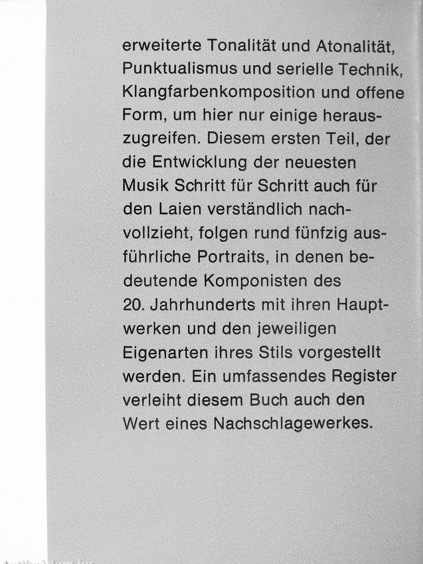 erweiterte Tonalität und Atonalität, Punktualismus und serielle Technik, Klangfarbenkomposition und offene Form, um hier nur einige herauszugreifen. Diesem ersten Teil, der die Entwicklung der neuesten Musik Schritt für Schritt auch für den Laien verständlich nachvollzieht, folgen rund fünfzig ausführliche Portraits, in denen bedeutende Komponisten des 20. Jahrhunderts mit ihren Hauptwerken und den jeweiligen Eigenarten ihres Stils vorgestellt werden. Ein umfassendes Register verleiht diesem Buch auch den Wert eines Nachschlagewerkes.