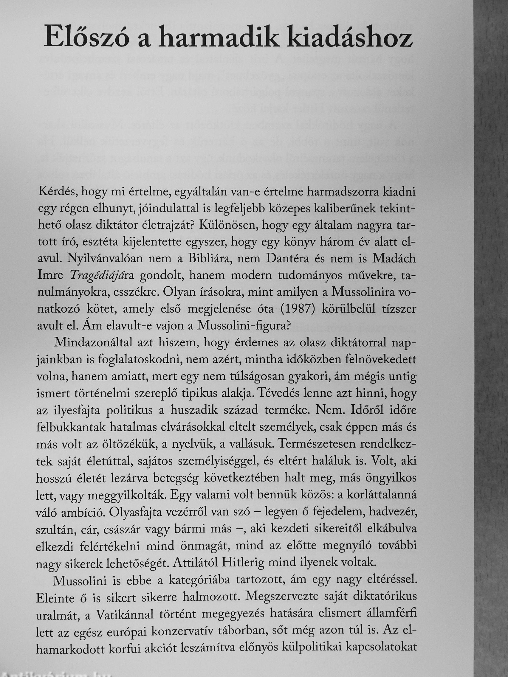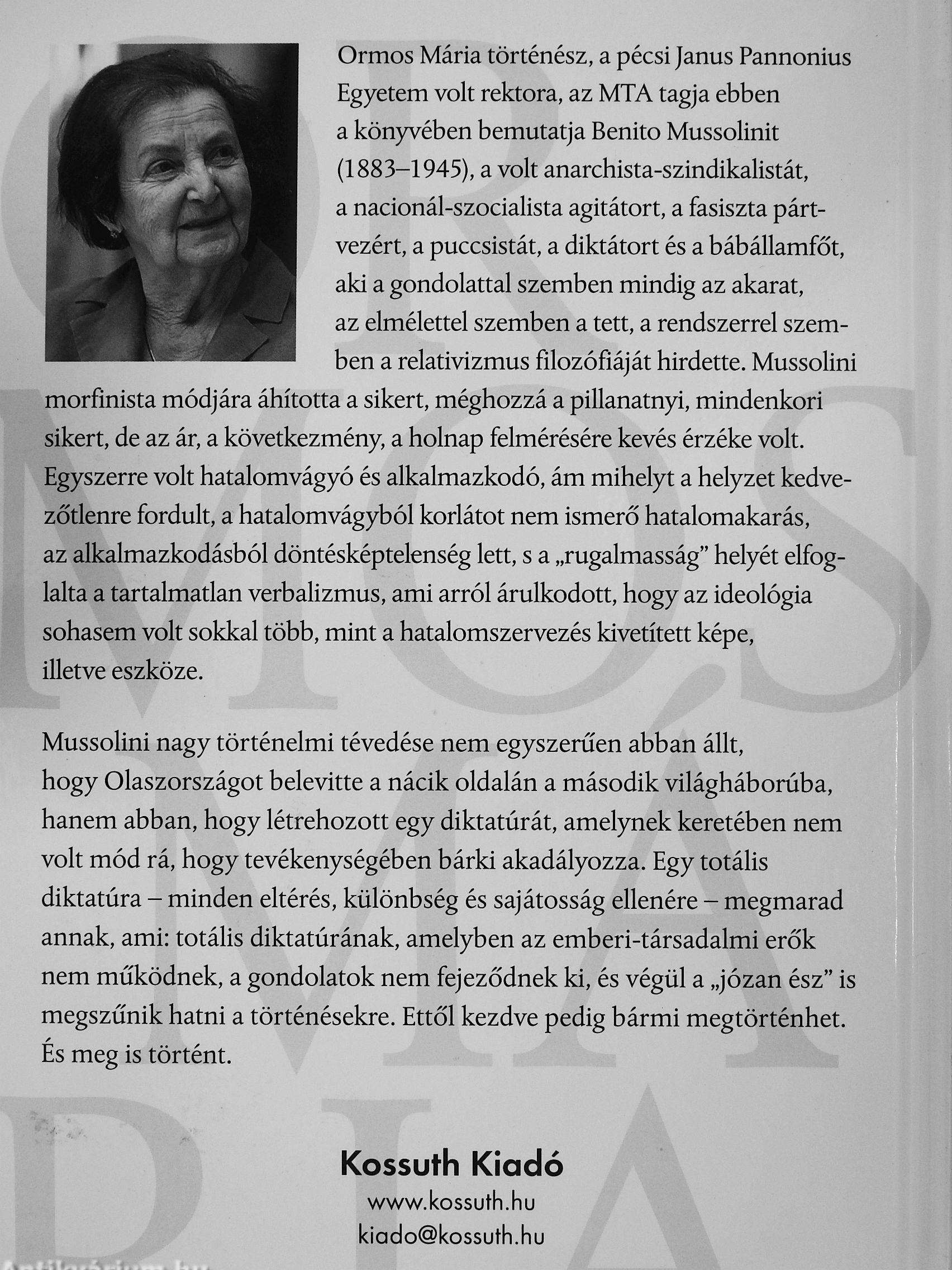 Ormos Mária történész, a pécsi Janus Pannonius Egyetem volt rektora, az MTA tagja ebben a könyvében bemutatja Benito Mussolinit (1883-1945), a volt anarchista-szindikalistát, a nacionál-szocialista agitátort, a fasiszta pártvezért, a puccsistát, a diktátort és a bábállamfőt, aki a gondolattal szemben mindig az akarat, az elmélettel szemben a tett, a rendszerrel szemben a relativizmus filozófiáját hirdette. Mussolini morfinista módjára áhította a sikert, méghozzá a pillanatnyi, mindenkori sikert, de az ár, a következmény, a holnap felmérésére kevés érzéke volt. Egyszerre volt hatalomvágyó és alkalmazkodó, ám mihelyt a helyzet kedvezőtlenre fordult, a hatalomvágyból korlátot nem ismerő hatalomakarás, az alkalmazkodásból döntésképtelenség lett, s a „rugalmasság" helyét elfoglalta a tartalmatlan verbalizmus, ami arról árulkodott, hogy az ideológia sohasem volt sokkal több, mint a hatalomszervezés kivetített képe, illetve eszköze.