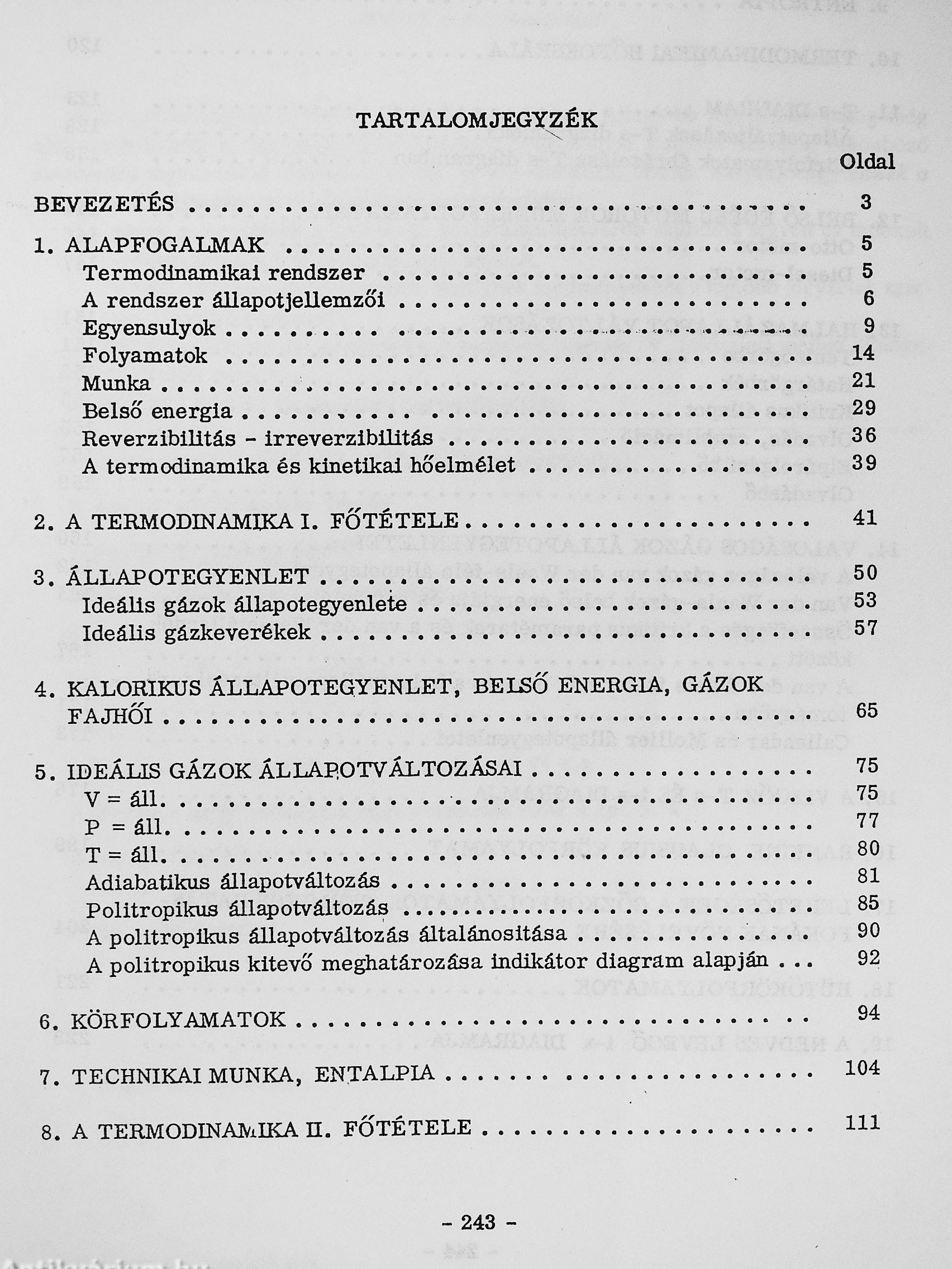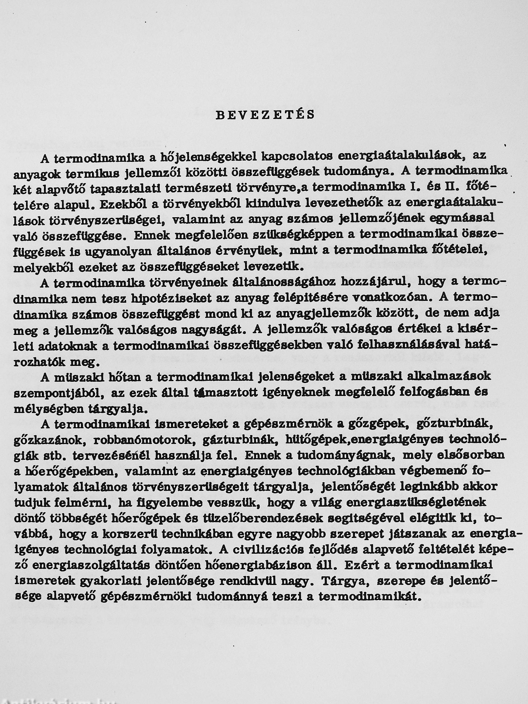 A termodinamika megtanulása az első olvasatra mindig a lehetetlennel határos vállalkozásnak bizonyul. A jegyzet anyagát úgy építettük fel, hogy a tárgy megértését a lehető legnagyobb mértékben megkönnyítsük. Ezért az első fejezettel viszonylag széles alapokat szerettünk volna lerakni, amit a második és a harmadik fejezetben a két főtétel szoros logikai sorrendű kifejtése követ. Egy negyedik fejezetbe foglaltuk össze a legfontosabb, olyan alkalmazásokat, amelyeket a kifejtés során nem tárgyaltunk. A jegyzetben általában és az említett utolsó fejezetben is kizárólag olyan alkalmazási területeket érintettünk, amelyekhez az elméleti anyag - azaz, a klasszikus termodinamika egykomponensű rendszereken bemutatott kifejtése - elégséges alapot nyújt. Ez alól csak az utolsó, az alternatív energiaforrásokkal foglalkozó alfejezet jelent - kis mértékben - kivételt.