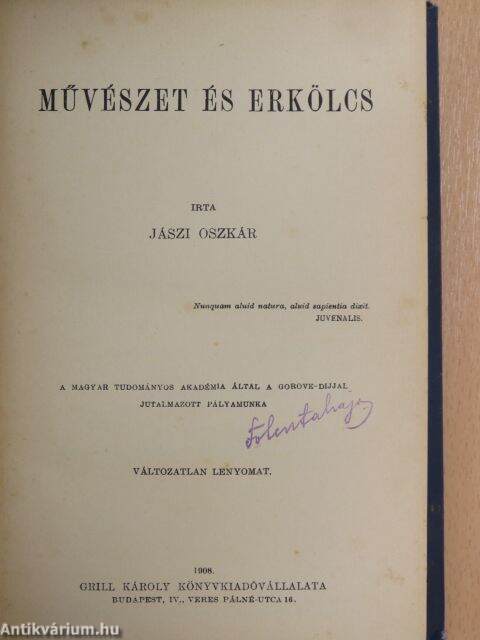 Ez a könyv feleletet igyekszik adni a Magyar Tud. Akadémia által kitűzött, „A művészet és az erkölcs viszonya egymáshoz" cimű pályakérdésre. Közel három éve annak, hogy e munkával elkészültem, anélkül, hogy azt kiadtam volna. Ugyanis az akadémiai pályázat eldöntése után már más dolgozattal voltam elfoglalva, melyet nem akartam befejezése előtt féretenni. Így meglehetősen huzamos idő telt el addig, mig e munkának sajtó alá rendezéséhez foghattam. Vissza