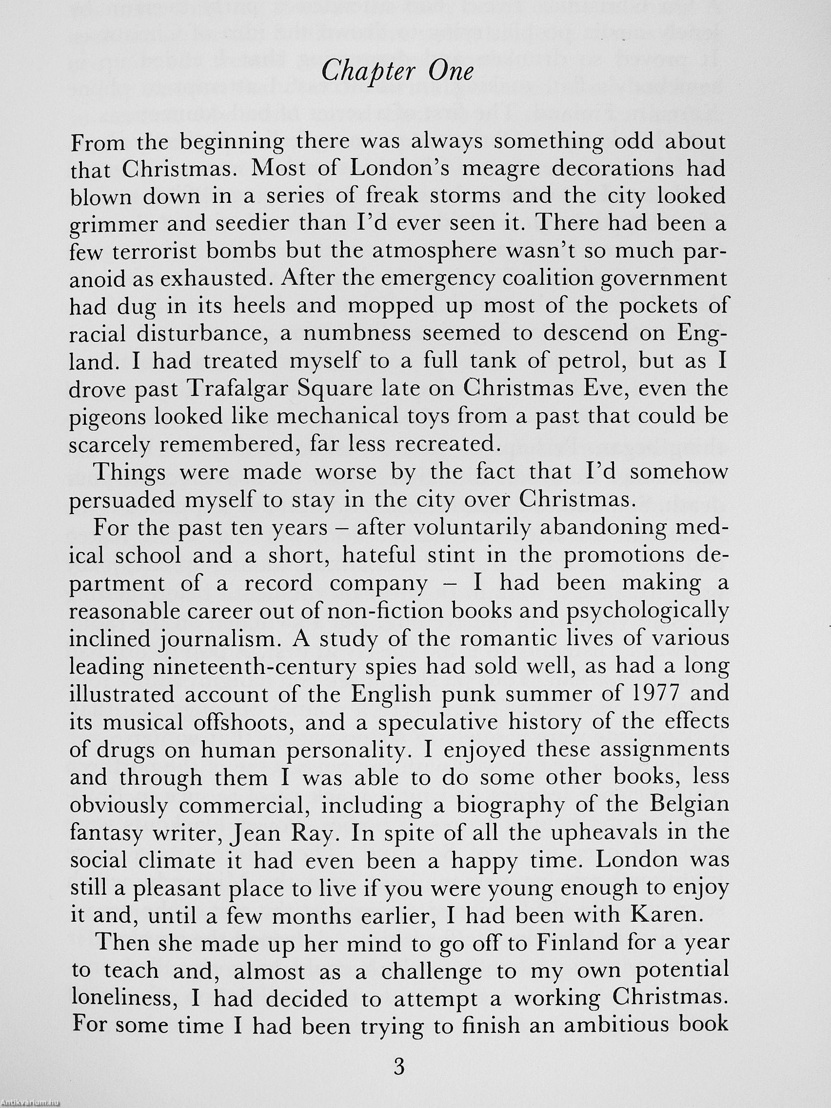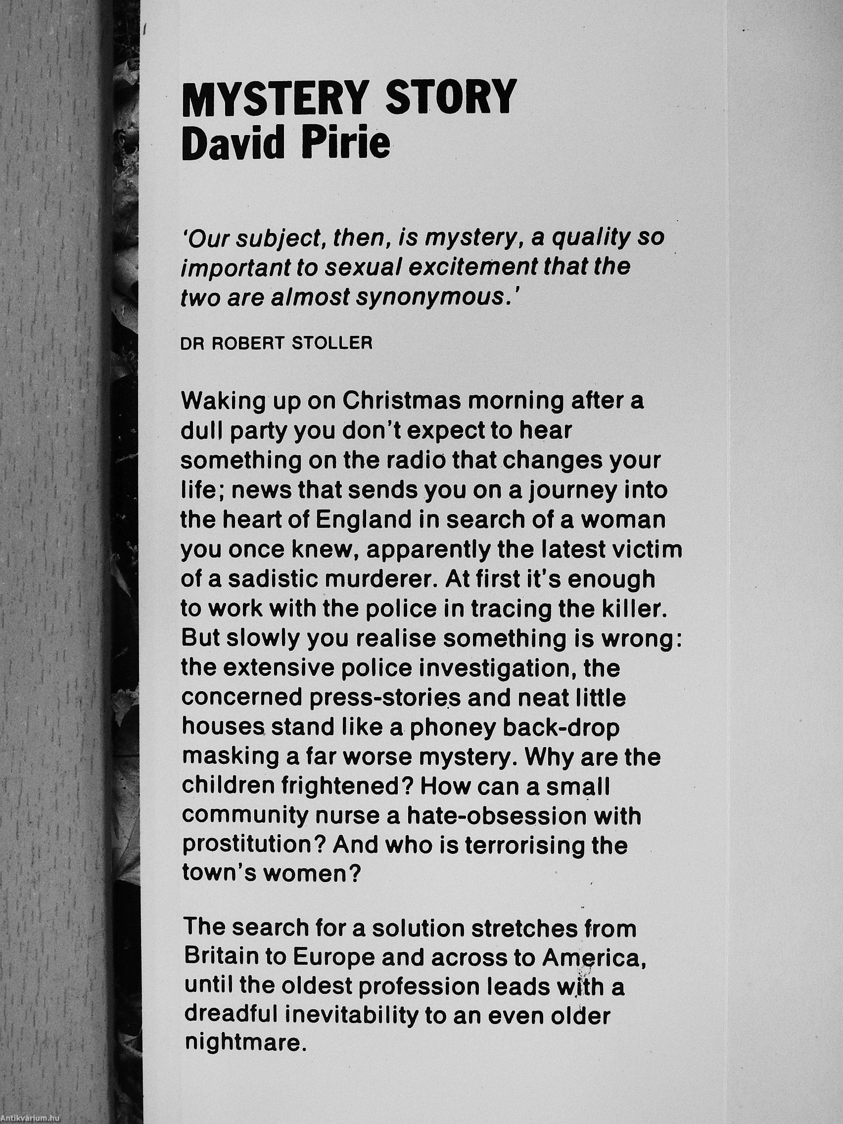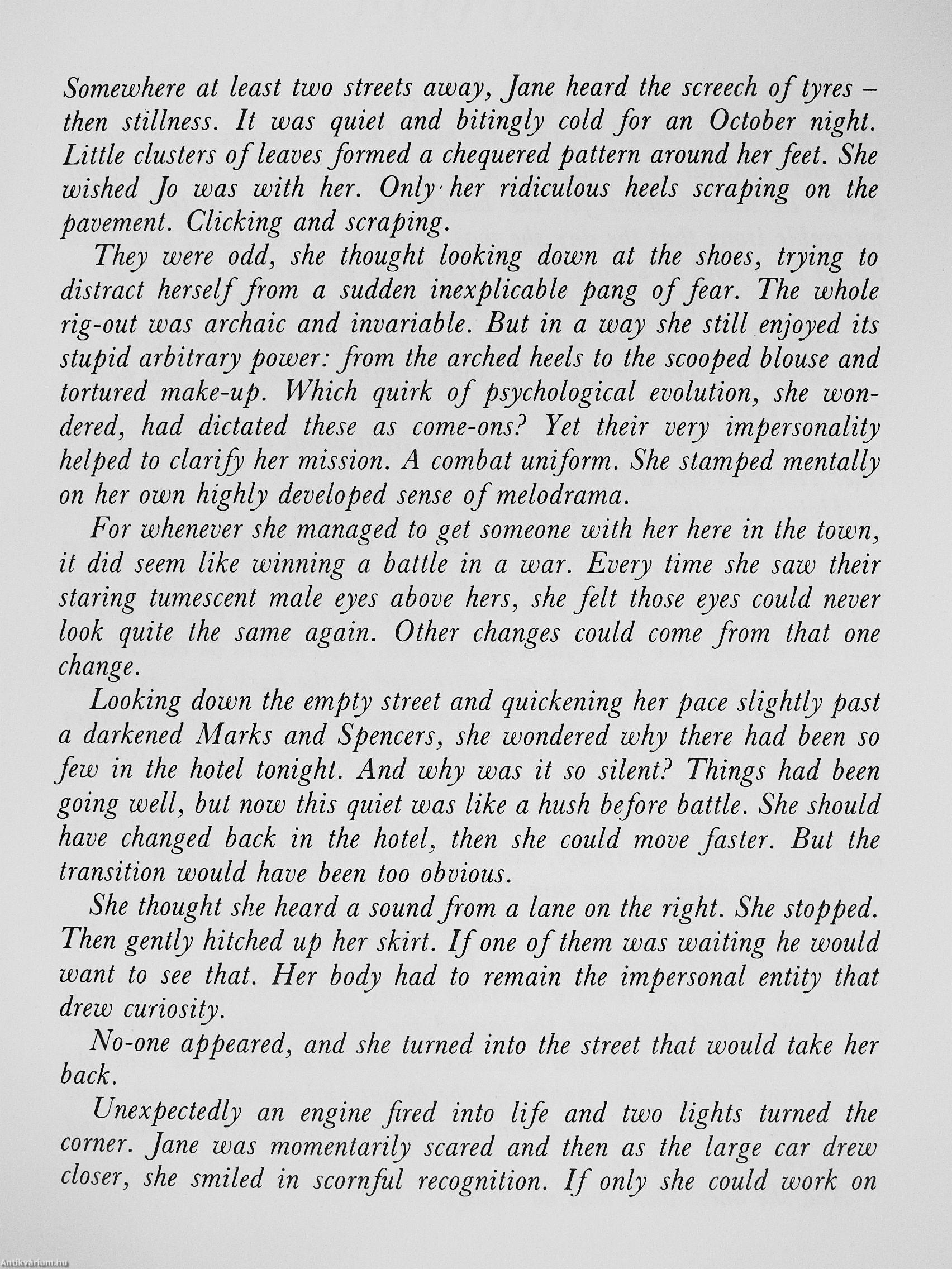 Waking up on Christmas morning after a dull party you don't expect to hear something on the radio that changes your life; news that sends you on a journey into the heart of England in search of a woman you once knew, apparently the latest victim of a sadistic murderer. At first it's enough to work with the police in tracing the killer. But slowly you realise something is wrong: the extensive police investigation, the concerned press-stories and neat little houses stand like a phoney back-drop masking a far worse mystery. Why are the children frightened? How can a small community nurse a hate-obsession with prostitution? And who is terrorising the town's women?