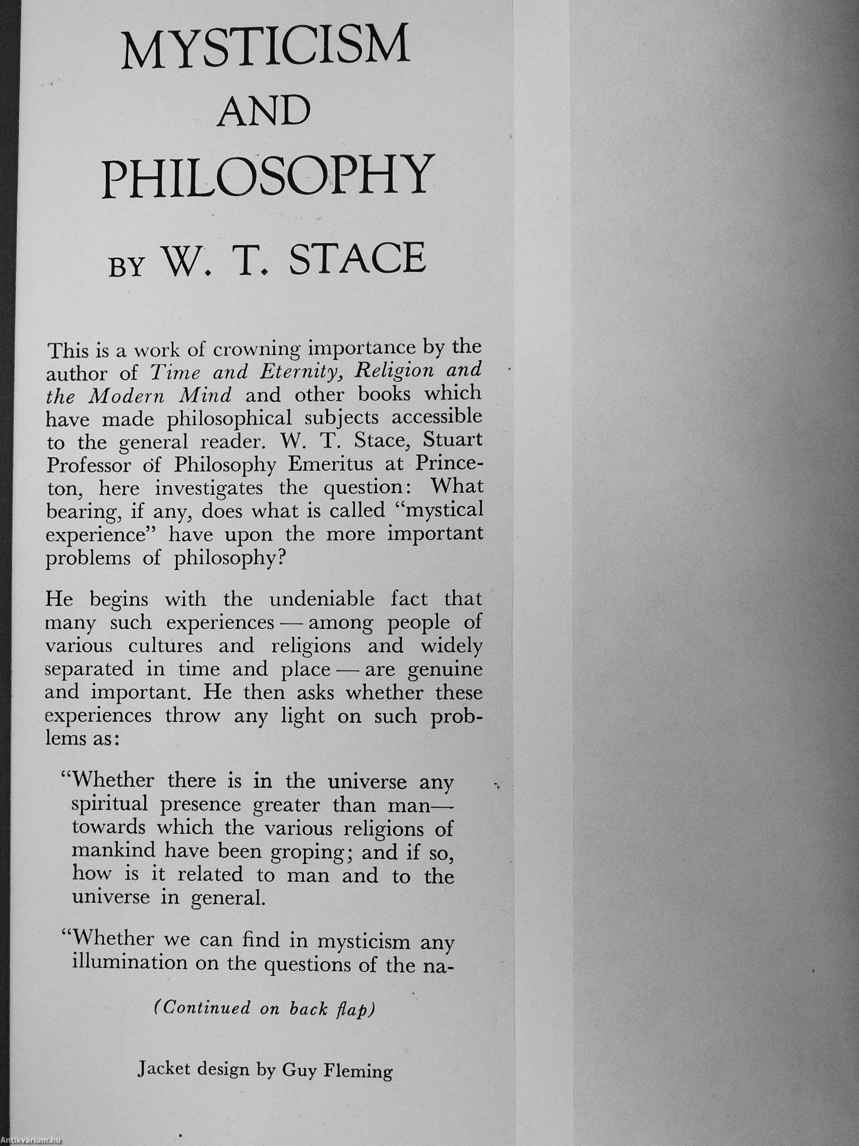 This is a wort; of crowning importance by the author of Time and Eternity, Religion and the Modern Mind and other books which have made philosophical subjects accessible to the general reader. W. T. Stace, Stuart Professor of Philosophy Emeritus at Princeton, here investigates the question: What bearing, if any, does what is called "mystical experience" have upon the more important problems of philosophy?