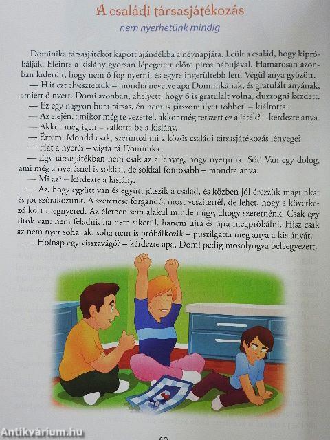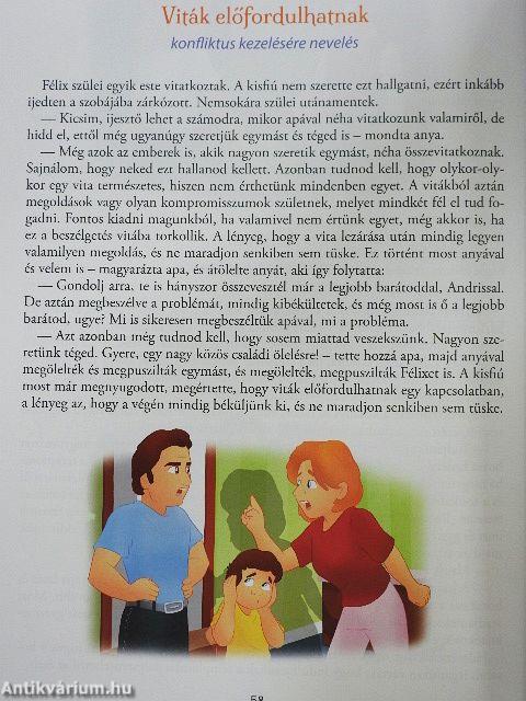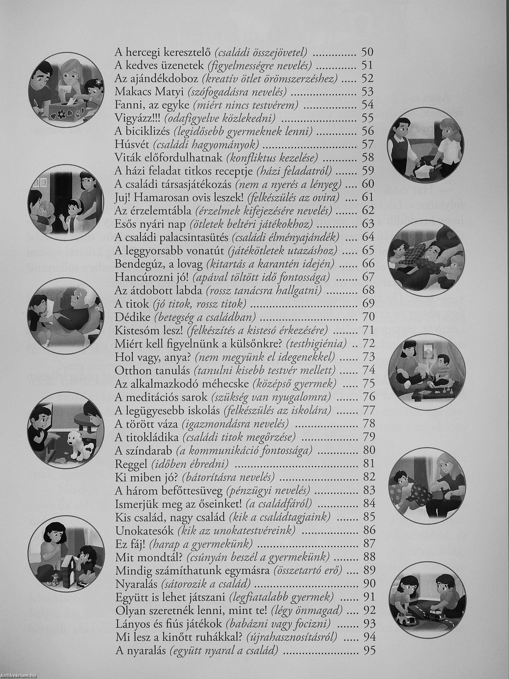 Mi a boldog családi élet alapja? Erre a kérdésre könnyű azt válaszolni, hogy természetesen a szeretet. De hogyan tud ez megvalósulni a mindennapokban? Milyen módon éreztethetjük a családtagjainkkal, hogy fontosak a számunkra? Ha probléma adódik a családban, hogyan kezdjünk el közösen beszélgetni úgy, hogy annak eredménye is legyen? Mesekönyvünk rövid meséi nemcsak a vidám családi hétköznapokat, ünnepeket, családi tradíciókat mutatják be, de támpontokat adnak az olyan „kényes" témák feldolgozásához is, mint amilyen