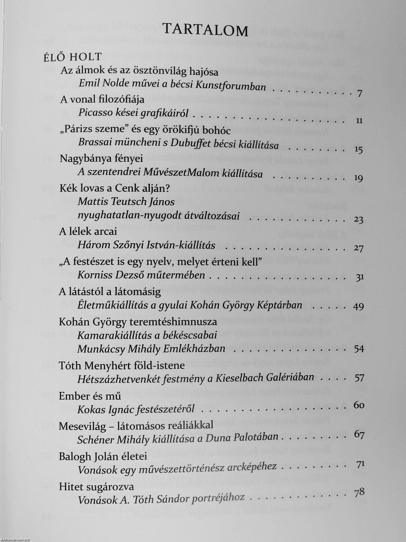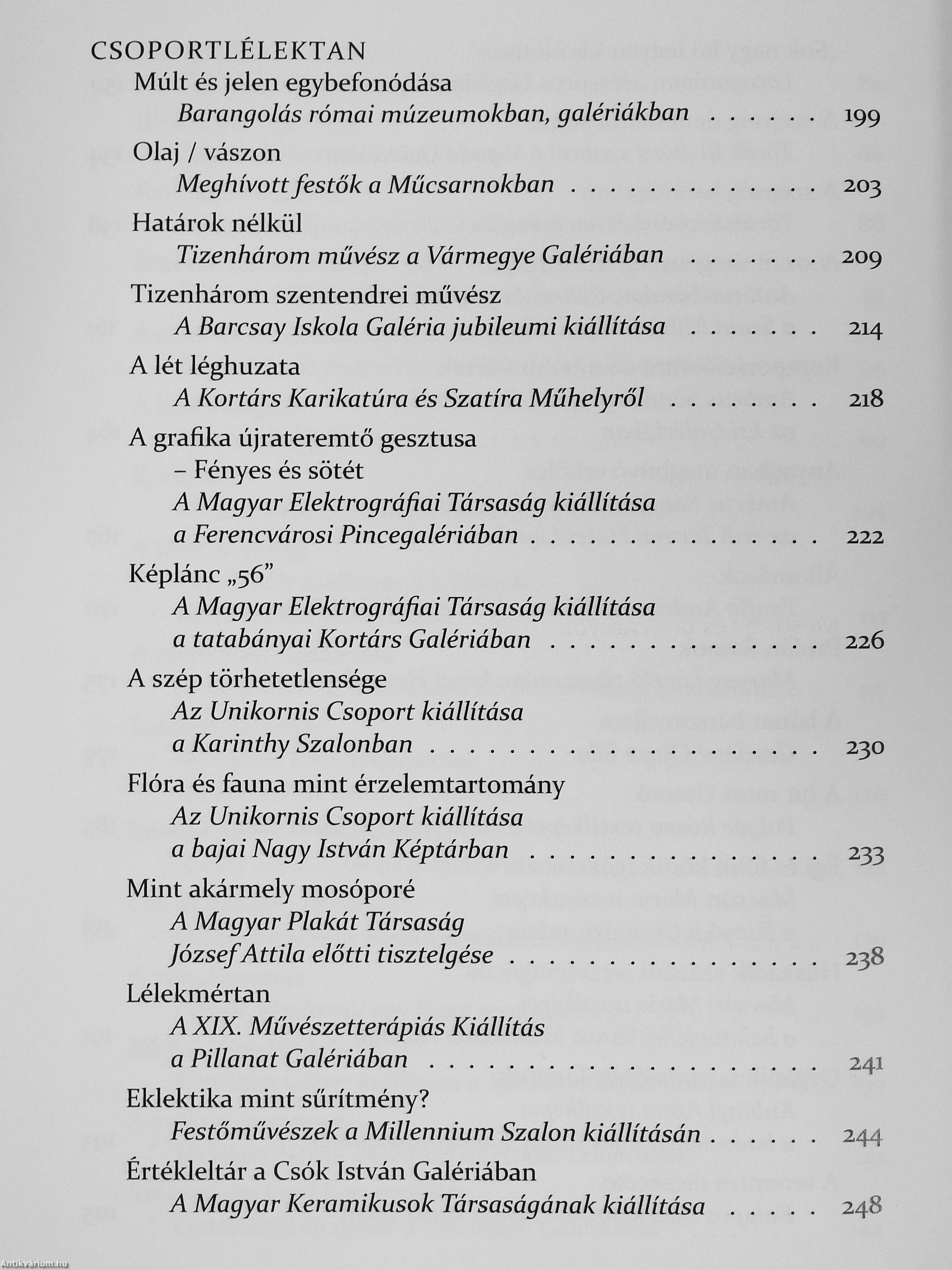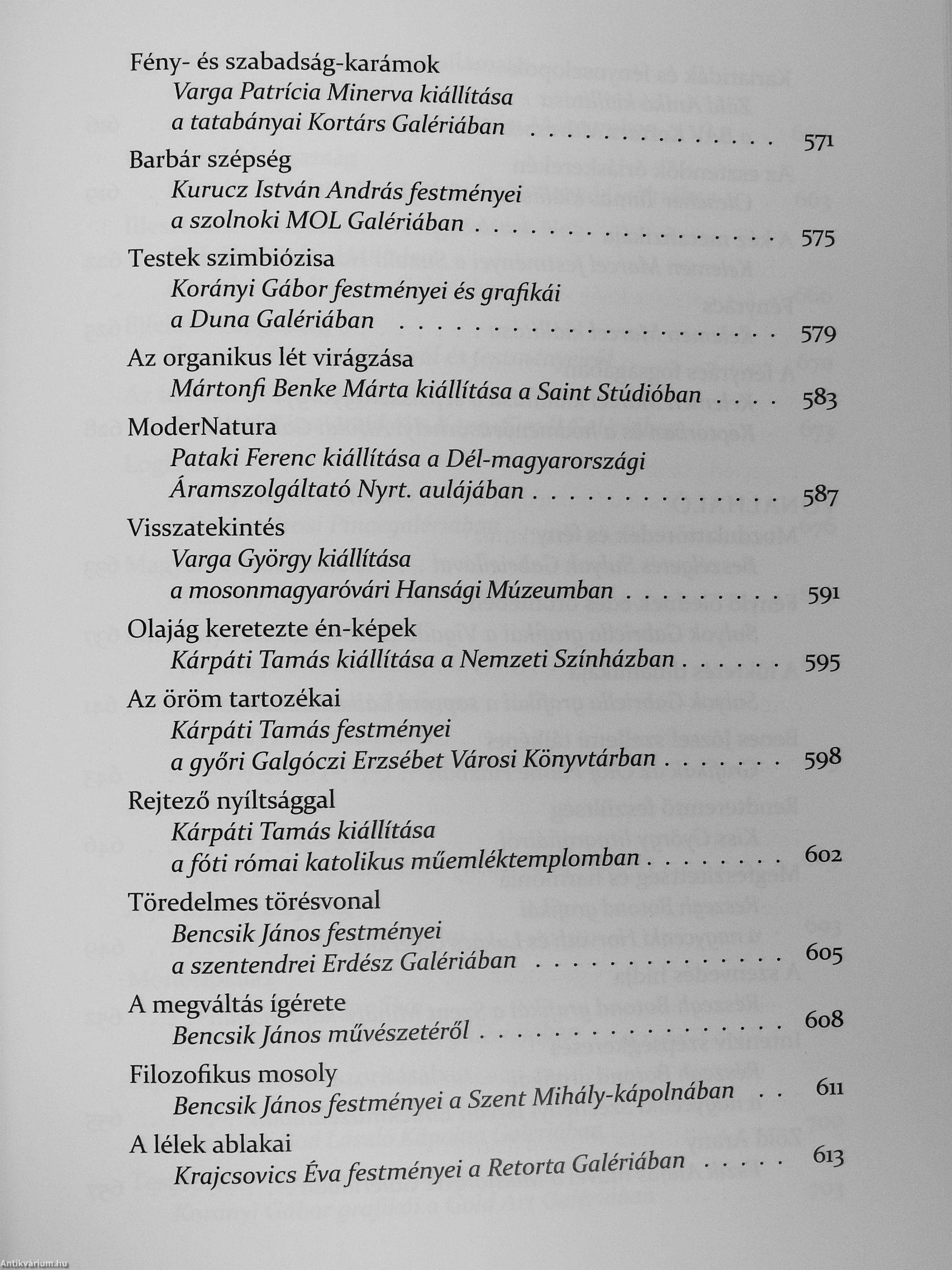 A könyv .<iyolc nagy fejezetből áll. A tematikus egységek mindegyikében ér- ^ tékfeltáró és értékálló szövegek: cikkek, ' tárlatnyitók, portrék, beszélgetések, tanulmányok szakoznak - sok-sok tucat J alkotóról.