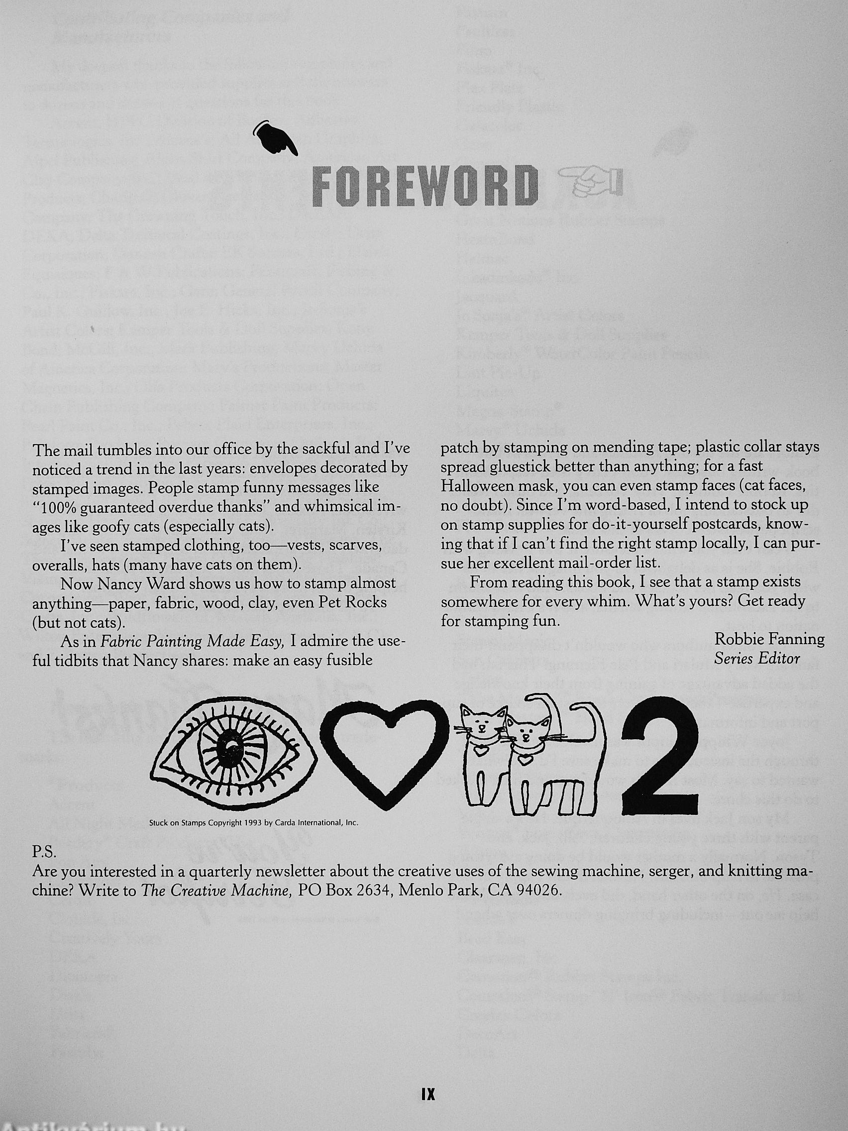 This concise book shows you the vast range of ready-made stamps, from hilarious mottos to fantastical animals. It also tells you how to make your own stamps, as well as how to clean them. In the process you'll learn how to stamp on paper, fabric, wood, clay, even stones. In Nancy Ward's usual way, the book is stuffed with information and projects. Learn about: