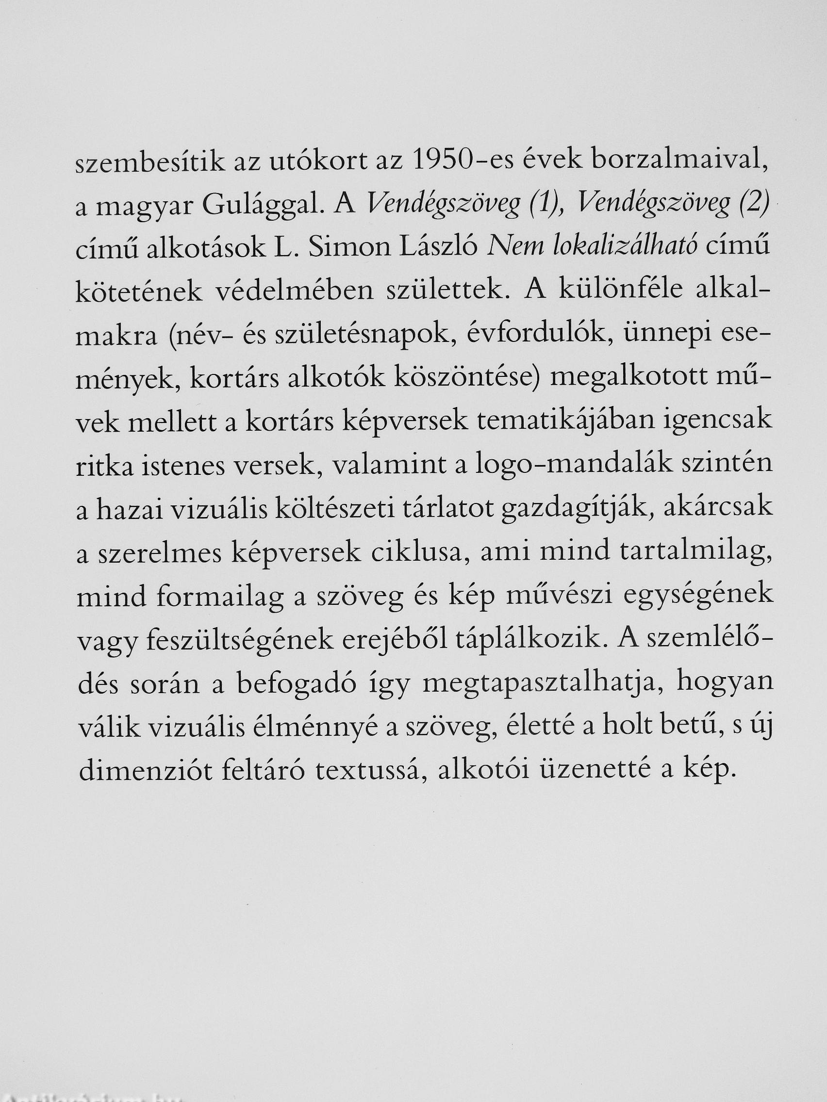 szembesítik az utókort az 1950-es évek borzalmaival, a magyar Gulággal. A Vendégszöveg (1), Vendégszöveg (2) című alkotások L. Simon László Nem lokalizálható című kötetének védelmében szíilettek. A különféle alkalmakra (név- és születésnapok, évfordulók, ünnepi események, kortárs alkotók köszöntése) megalkotott művek mellett a kortárs képversek tematikájában igencsak ritka istenes versek, valamint a logo-mandalák szintén a hazai vizuális költészeti tárlatot gazdagítják^ akárcsak a szerelmes képversek ciklusa, ami mind tartalmilag, mind formailag a szöveg és kép művészi egységének vagy feszültségének erejéből táplálkozik. A szemlélődés során a befogadó így megtapasztalhatja, hogyan válik vizuális élménnyé a szöveg, életté a holt betű, s új dimenziót feltáró textussá, alkotói üzenetté a kép.