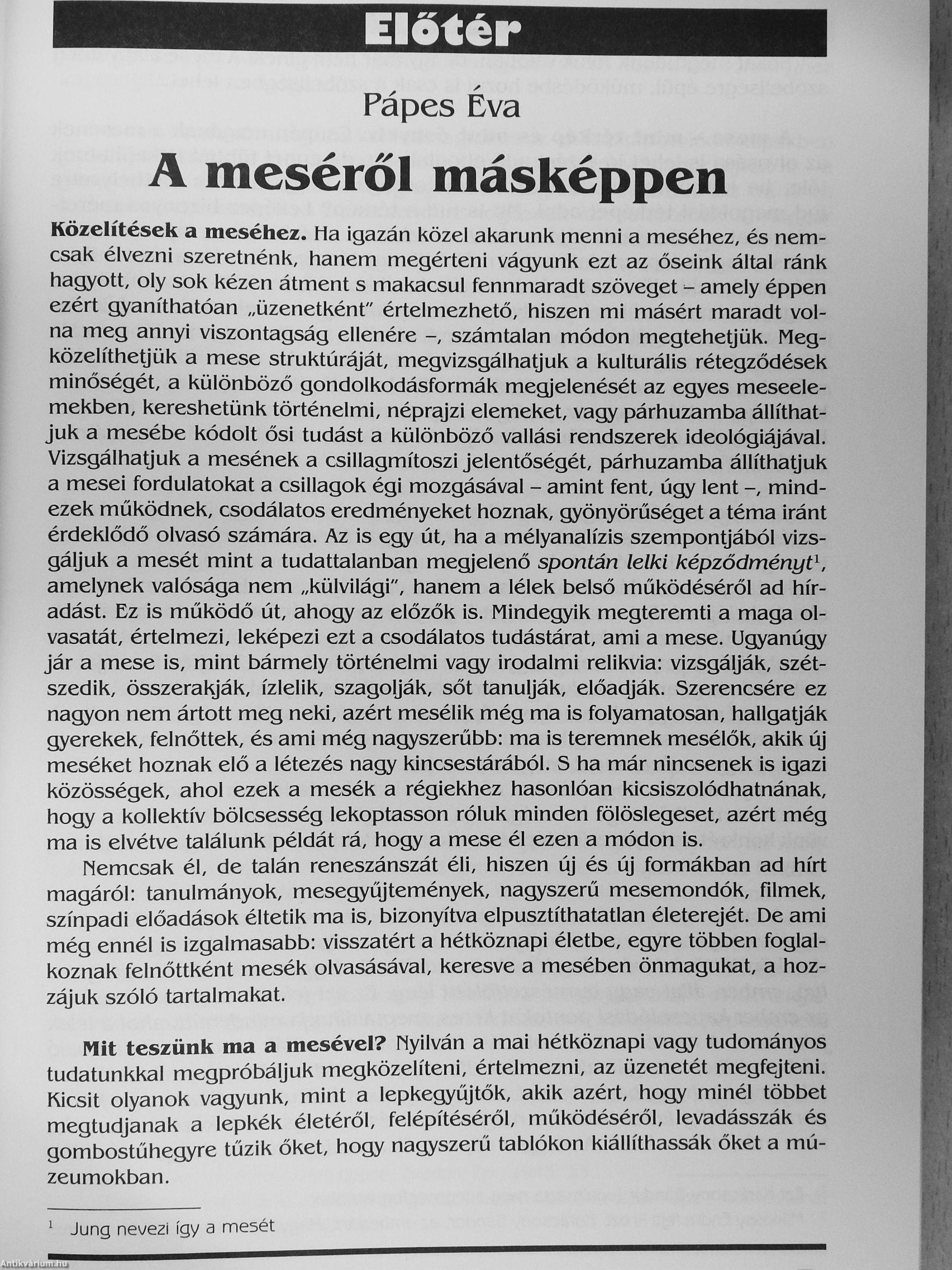 „Ha igazán közel akarunk menni a meséhez, és nemcsak élvezni szeretnénk, hanem megérteni vágyunk ezt az őseink által ránk hagyott, oly sok kézen átment s makacsul fennmaradt szöveget - amely éppen ezért gyaníthatóan »üzenetként« értelmezhető, hiszen mi másért maradt volna meg annyi viszontagság ellenére számtalan módon megtehetjük." (Pápes Éva)
