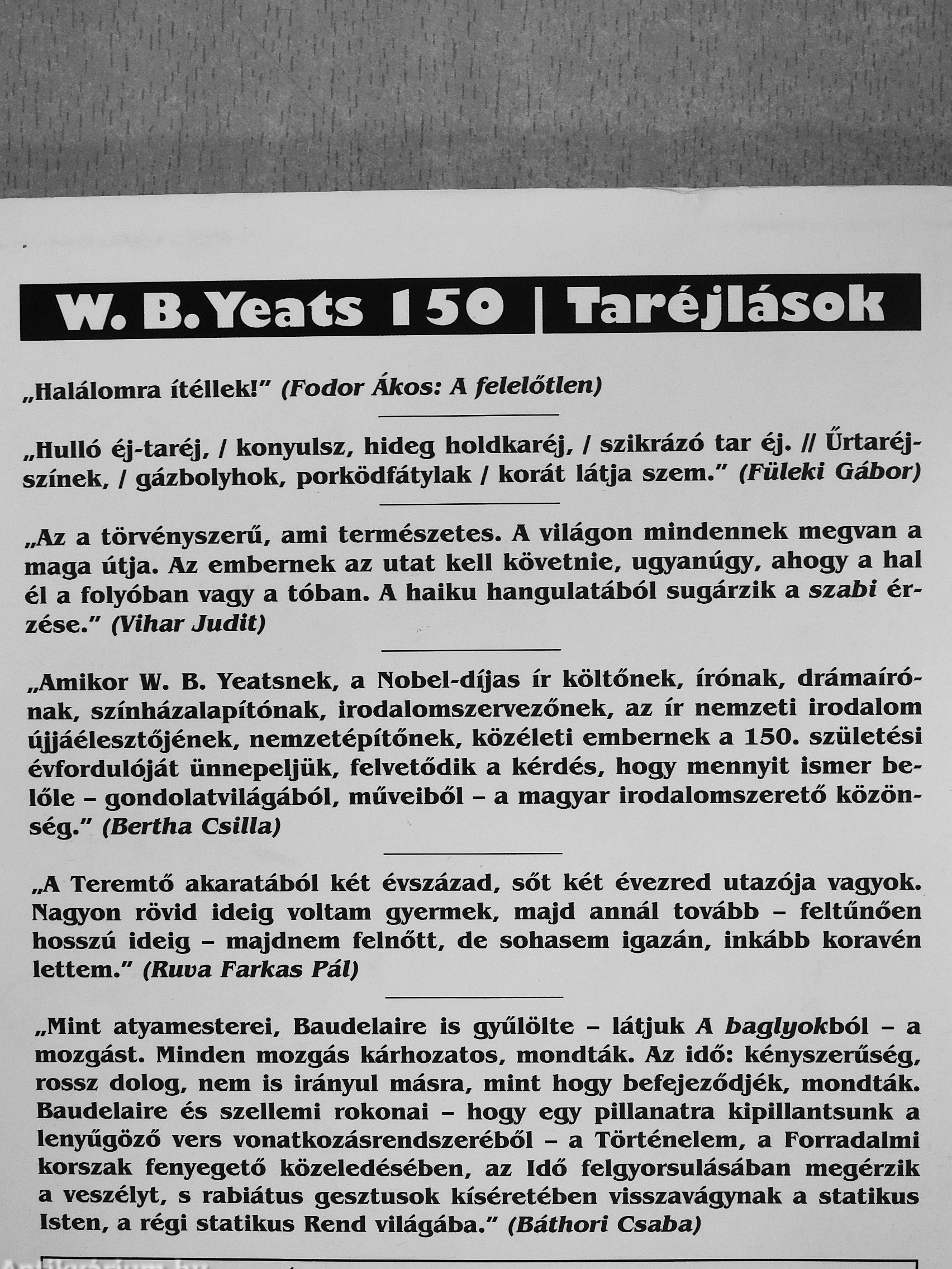 „Amikor W. B. Yeatsnek, a Nobel-díjas ír költőnek, írónak, drámaírónak, színházalapítónak, irodalomszervezőnek, az ír nemzeti irodalom újjáélesztőjének, nemzetépítőnek, közéleti embernek a 150. születési évfordulóját ünnepeljük, felvetődik a kérdés, hogy mennyit ismer belőle - gondolatvilágából, műveiből - a magyar irodalomszerető közönség." (Bertha Csilla)