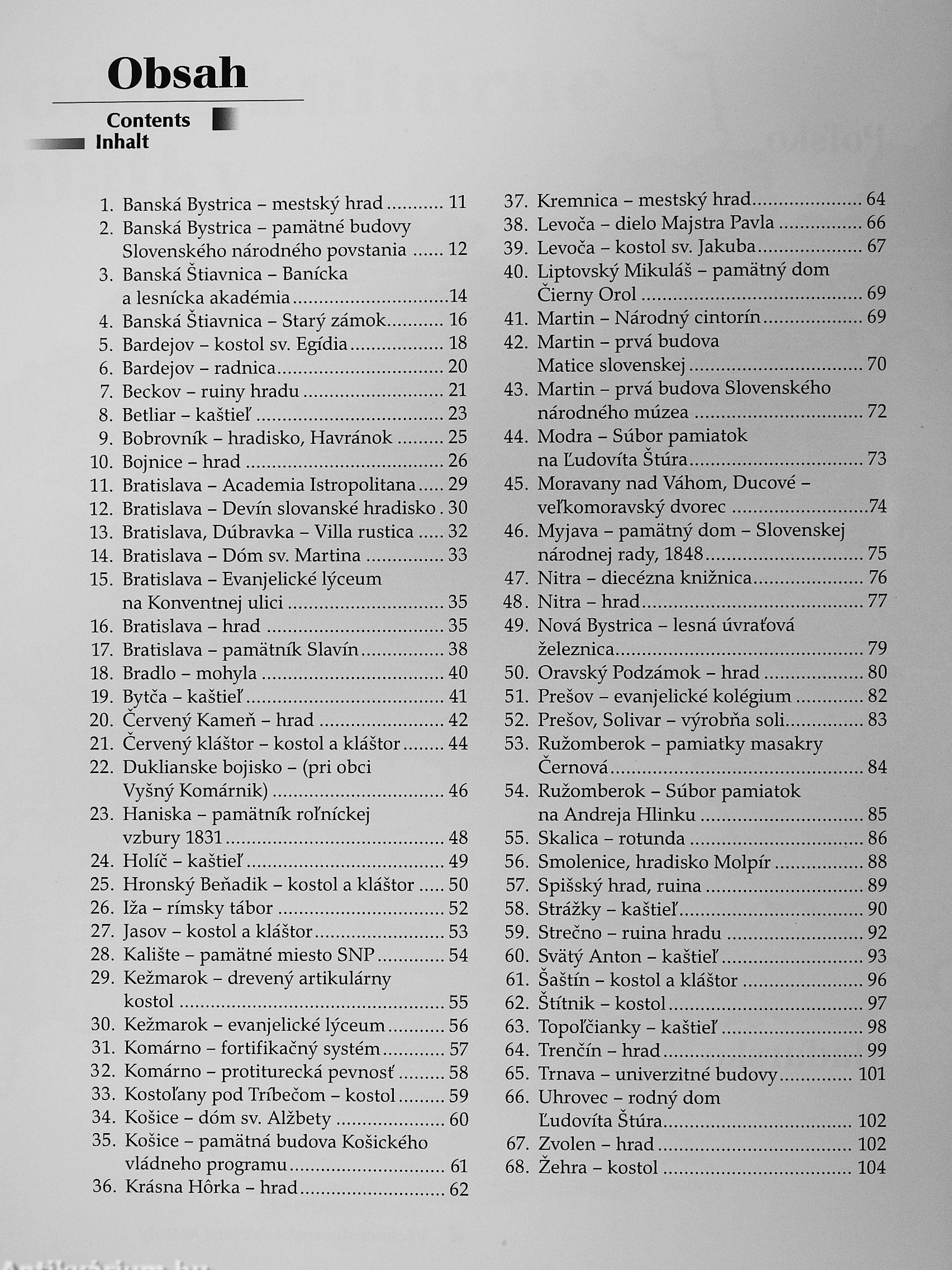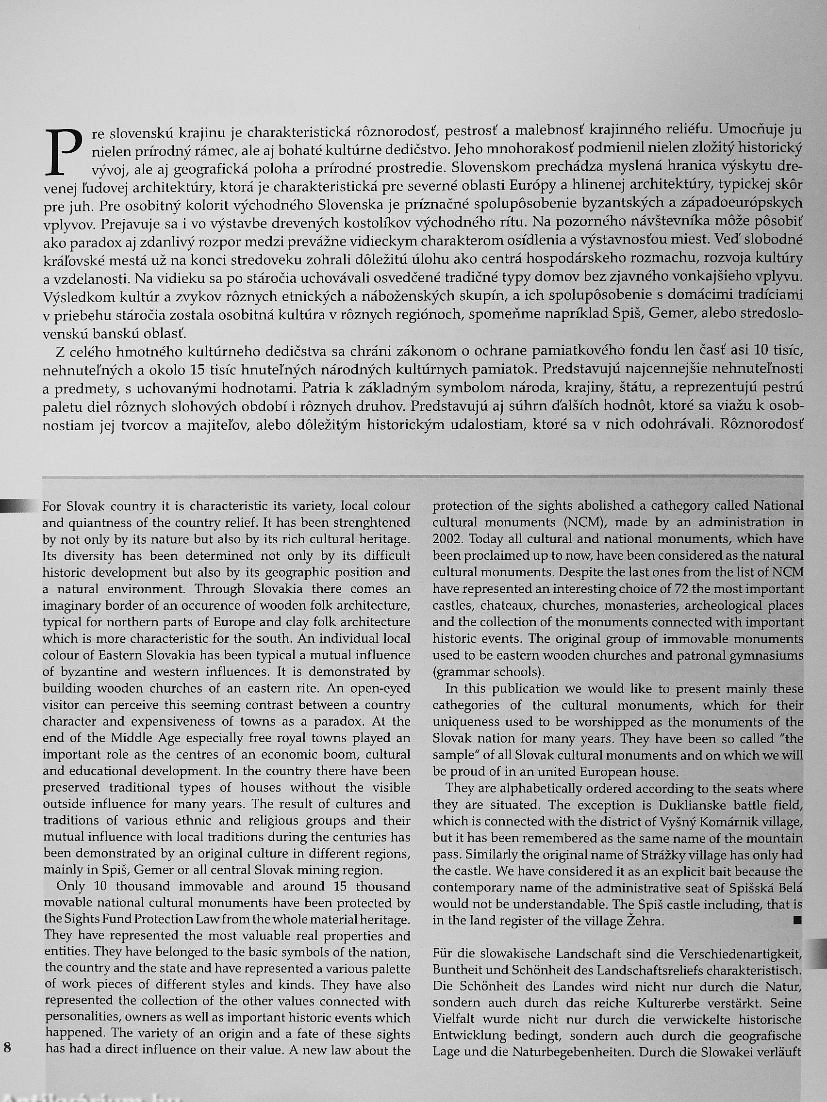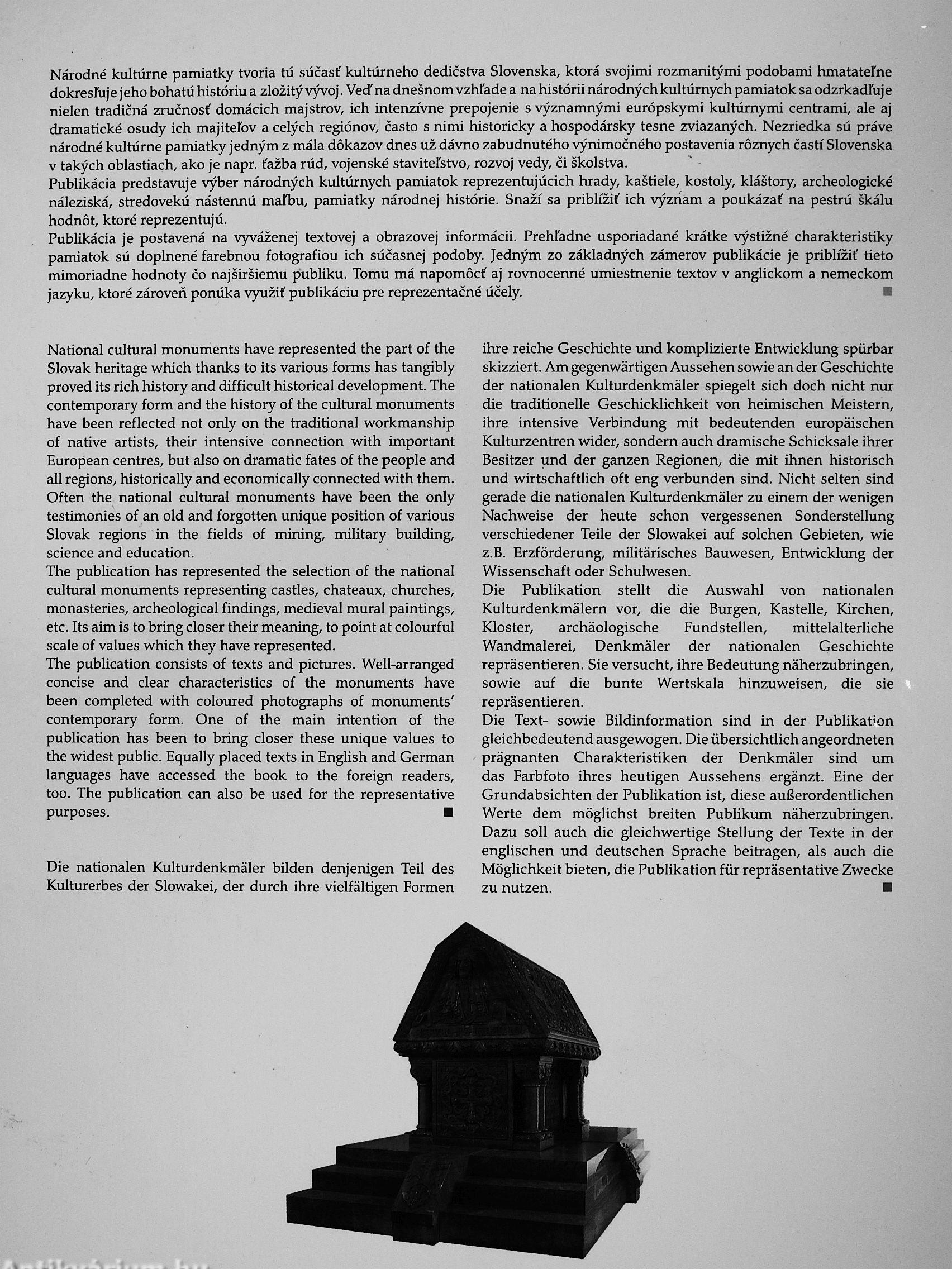 The publication has represented the selection of the national cultural monuments representing castles, chateaux, churches, monasteries, archeological findings, medieval mural paintings, etc. Its aim is to bring closer their meaning, to point at colourful scale of values which they have represented. The publication consists of texts and pictures. Well-arranged concise and clear characteristics of the monuments have been completed with coloured photographs of monuments' contemporary form. One of the main intention of the publication has been to bring closer these unique values to the vddest public. Equally placed texts in English and German languages have accessed the book to the foreign readers, too. The publication can also be used for the representative purposes. ¦