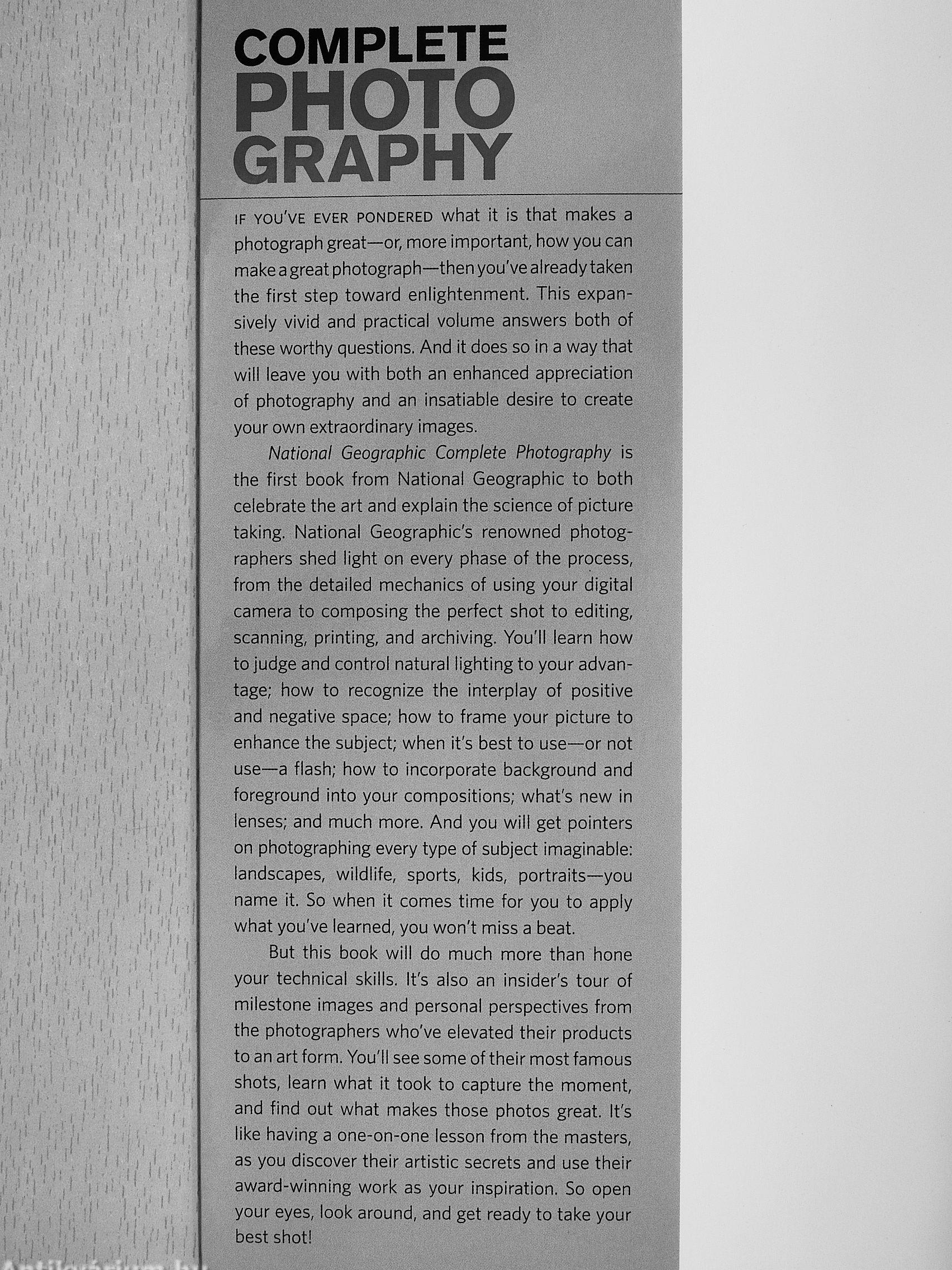 National Geographic Complete Photography is the first book from National Geographic to both celebrate the art and explain the science of picture taking. National Geographic's renowned photographers shed light on every phase of the process, from the detailed mechanics of using your digital camera to composing the perfect shot to editing, scanning, printing, and archiving. You'll learn how to judge and control natural lighting to your advantage; how to recognize the interplay of positive and negative space; how to frame your picture to enhance the subject; when it's best to use—or not use—a flash; how to incorporate background and foreground into your compositions; what's new in lenses; and much more. And you will get pointers on photographing every type of subject imaginable: landscapes, wildlife, sports, kids, portraits—you name it. So when it comes time for you to apply what you've learned, you won't miss a beat.