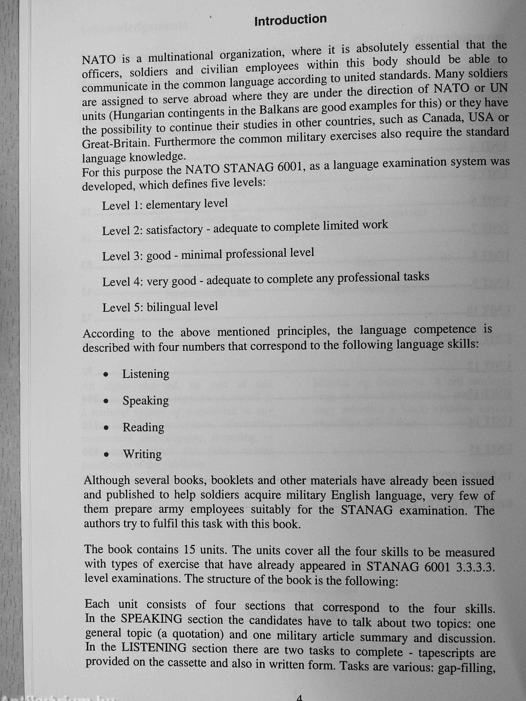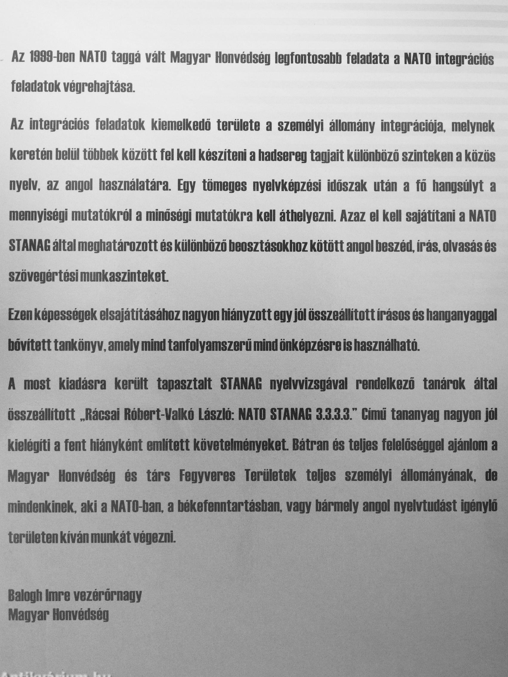 A most kiadásra került tapasztalt STANAG nyelvvizsgával rendelkező tanárok által összeállított „Rácsai Róbert-Valkó László: NATO STANAG 3.3.3.3." Című tananyag nagyon jól kielégíti a fent hiányként emHtett követelményeket Bátran és teljes felelőséggel ajánlom a Magyar Honvédség és társ Fegyveres Területek teljes személyi állományának, de mindenkinek, aki a NATO-ban. a békefenntartásban, vagy bármely angol nyehrtudást Igénylő területen kíván munkát vénezni.