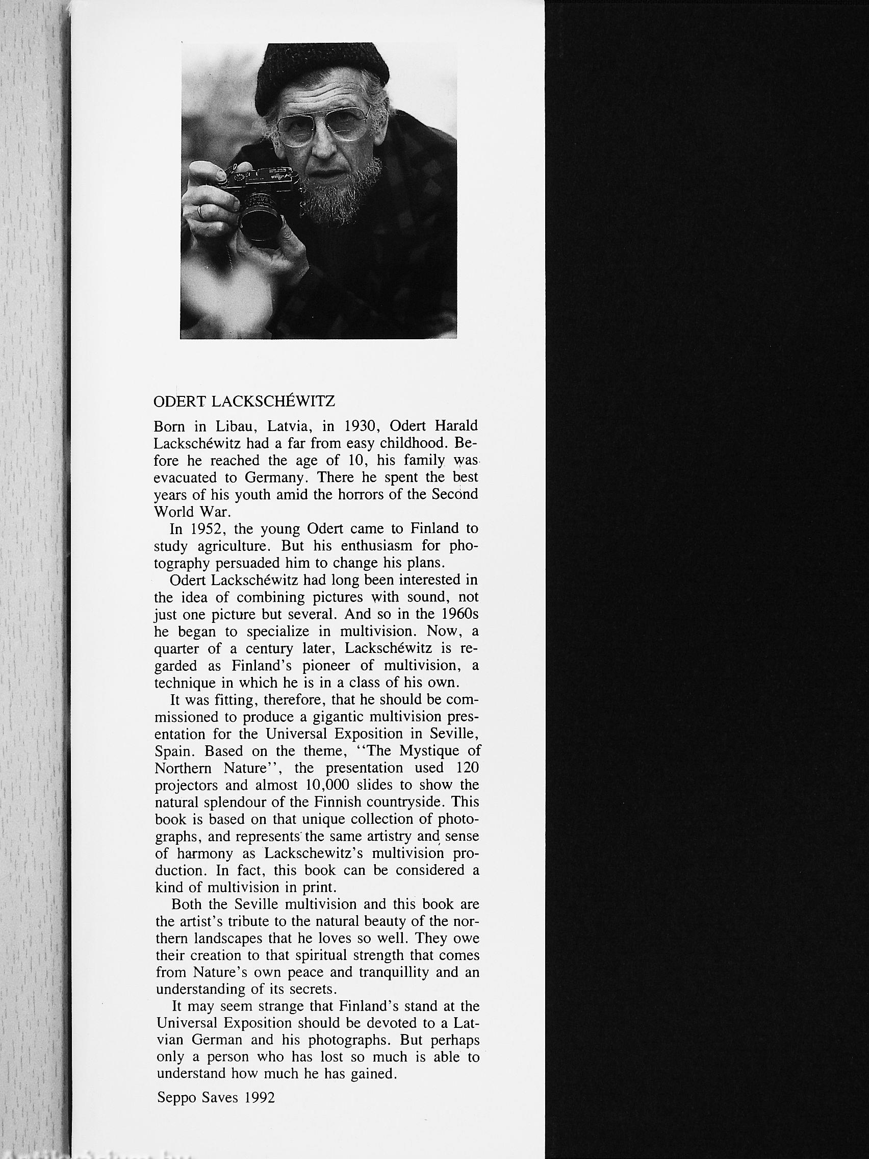 It was fitting, therefore, that he should be commissioned to produce a gigantic multivision presentation for the Universal Exposition in Seville, Spain. Based on the theme, "The Mystique of Northern Nature", the presentation used 120 projectors and almost 10,000 slides to show the natural splendour of the Finnish countryside. This book is based on that unique collection of photographs, and represents the same artistry and sense of harmony as Lackschewitz's multivision production. In fact, this book can be considered a kind of multivision in print.