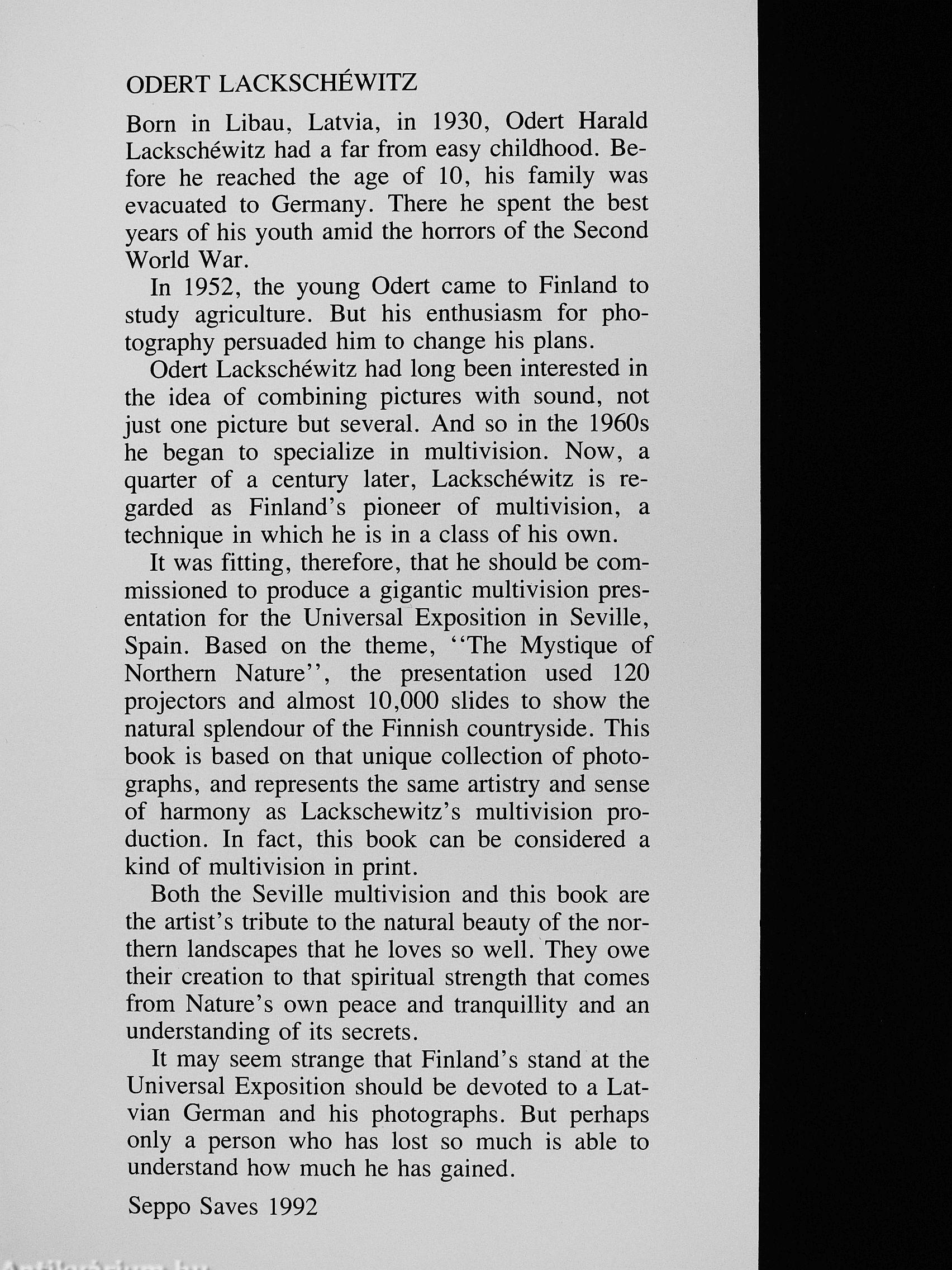 It was fitting, therefore, that he should be commissioned to produce a gigantic multivision presentation for the Universal Exposition in Seville, Spain. Based on the theme, "The Mystique of Northern Nature", the presentation used 120 projectors and almost 10,000 slides to show the natural splendour of the Finnish countryside. This book is based on that unique collection of photographs, and represents the same artistry and sense of harmony as Lackschewitz's multivision production. In fact, this book can be considered a kind of multivision in print.