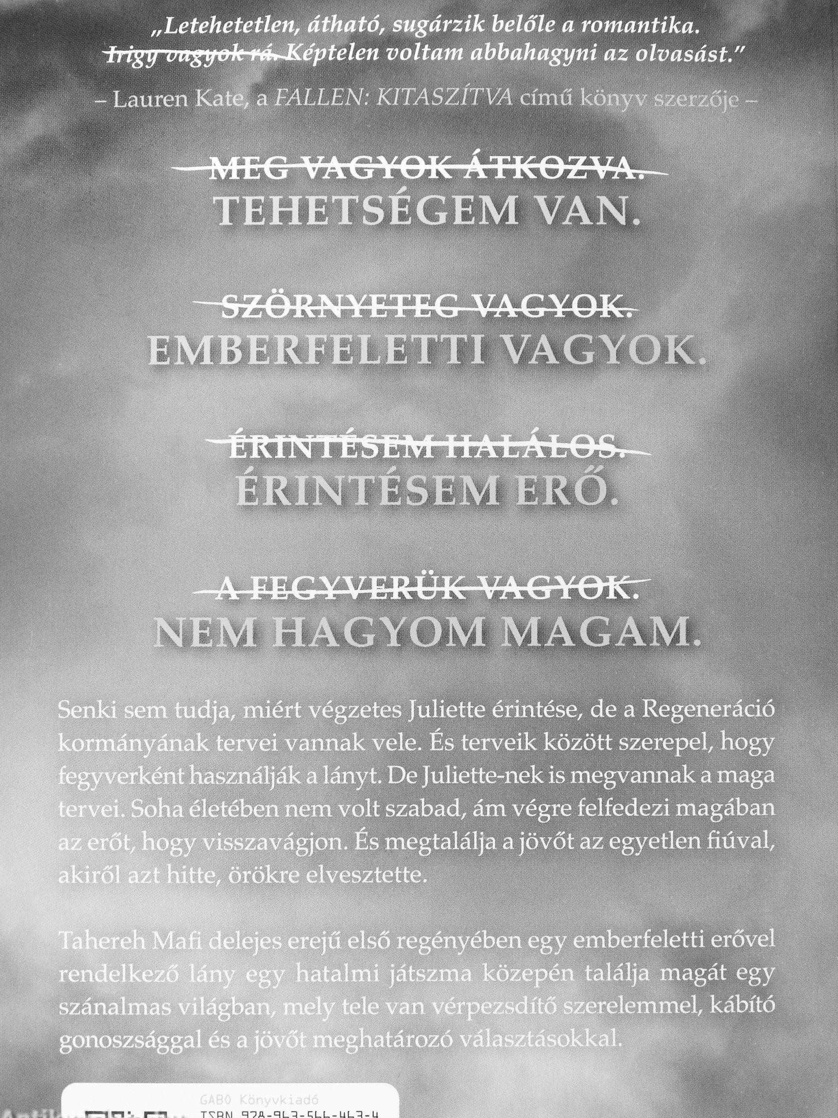 Tahereh Mafi delejes erejű első regényében egy emberfeletti erővel rendelkező lány egy fiatalmi játszma közepén találja magát egy szánalmas világbatli, mely tele yérpezsdítő szerelemmel, kábító gonoszsággal és a j^gm^h^tározó választásokkal.