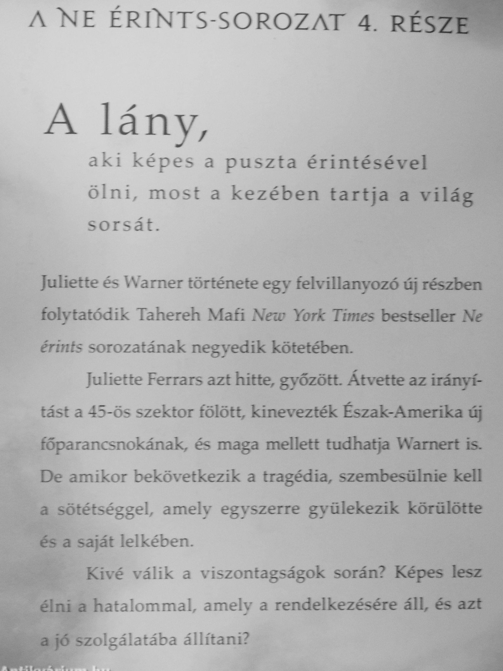 Juliette és Wamer története egy feh illanyozó új részben folytatódik Tahereh Mafi New York Times bestseller Ne érints sorozatának negyedik kötetében.