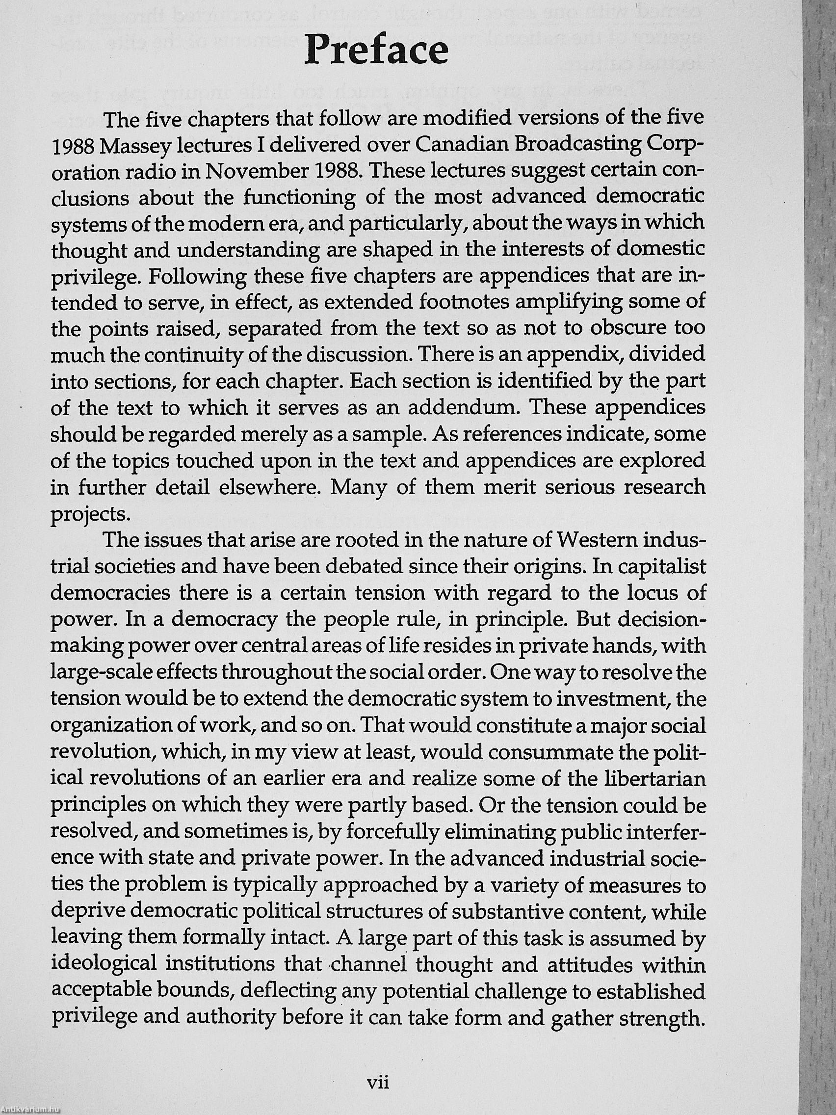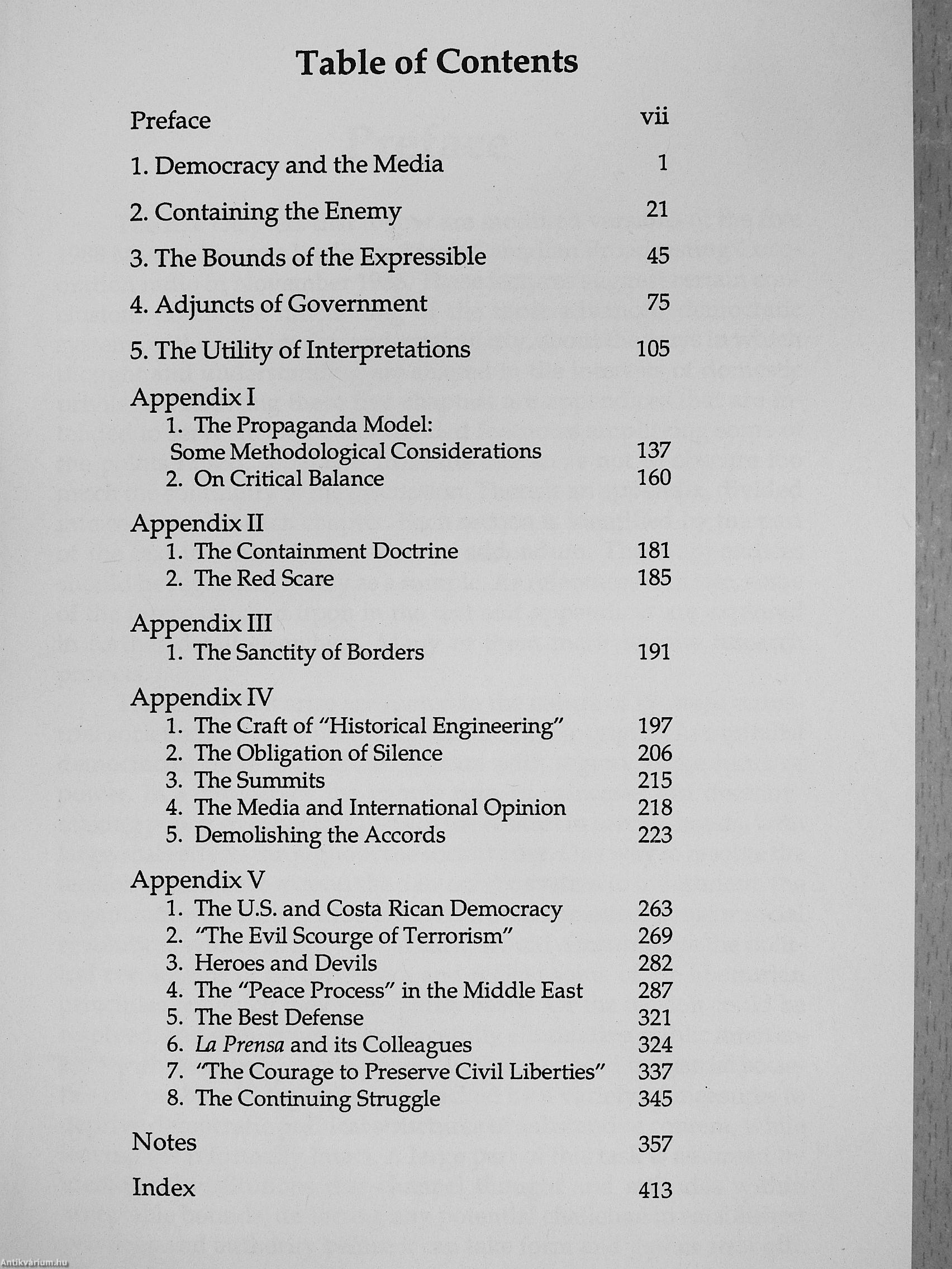 This book applies the propaganda model Chomsky has developed with Edward Herman to media coverage of the diplomatic process in Central America and the Middle East, human rights issues, terrorism, and other topics, revealing the crucial function of the media and educated elites in limiting democracy in the United States.