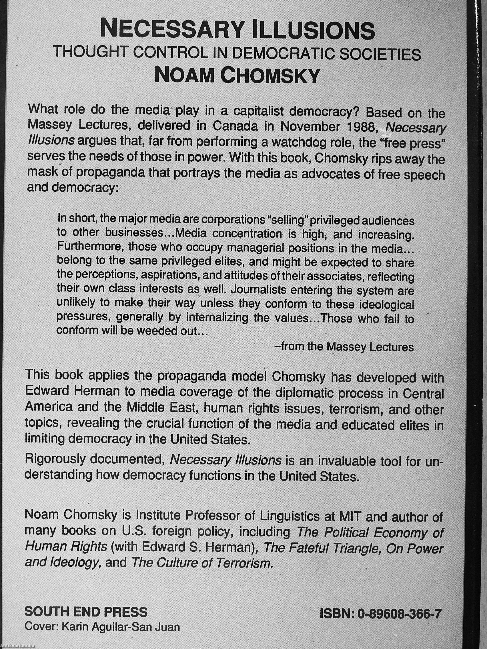 What role do the media play In a capitalist democracy? Based on the Massey Lectures, delivered in Canada In November 1988, Necessary Illusions argues that, far from performing a watchdog role, the iree press" serves the needs of those in power. With this book, Chomsky rips away the mask'of propaganda that portrays the media as advocates of free speech and democracy: