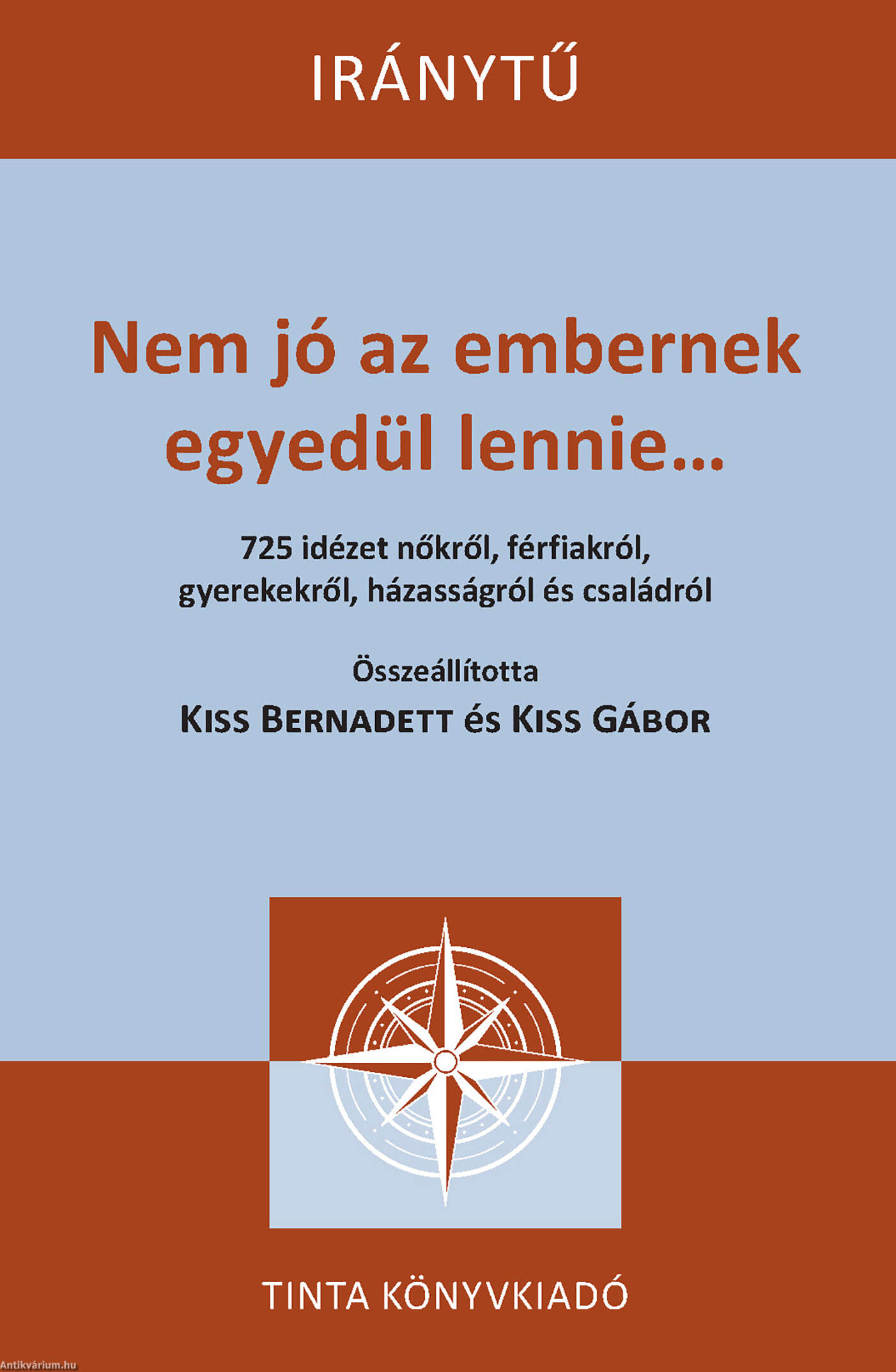 A TINTA Könyvkiadó Iránytű sorozatának tagjaként jelenik meg a Nem jó az embernek egyedül lennie... című kötet, mely olyan idézetek gyűjteménye, amelyek végigkalauzolnak bennünket az egyedülléttől, fiatalkori szerelemtől, a párválasztástól kezdve a gyermekáldáson át egészen az idősödő házaspárok előtt álló kihívásokig. A kötet széles körben merít a világ minden tájáról származó híres szerzők gondolataiból. Az ókortól kezdve egészen a 20. századig találunk idézeteket a kiadványban tematikus elrendezésben. Inspiráló gondolatokat olvashatunk a következőkről: - Mi a férfi és a nő kötelessége? - Milyen a jó feleség és a jó férj? - Mitől lesz boldog egy házasság? - Milyen a jó szülő?- Mik a szülők kötelességei? - Hogyan nevelhetnek a szülők boldog gyermeket? - Miként viselkedjen a gyermek? - Mi a helyes kapcsolattartás másokkal? "Az emberi lét forrása a család; azoknak az ingadozó lépéseknek, amelyekkel az ember megkezdi földi pályáját, színtere a családi kör." (Prohászka Ottokár)